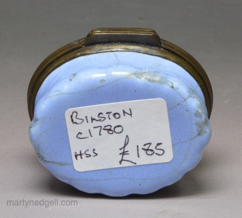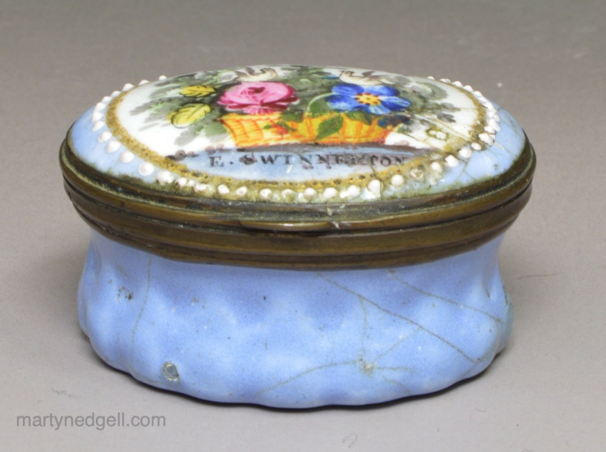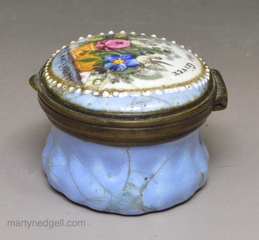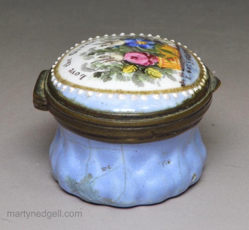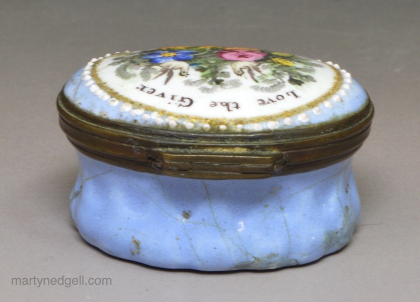 / Bilston enamel patch box, circa 1780 ‘Love the Giver’ ‘E. Swinnerton’