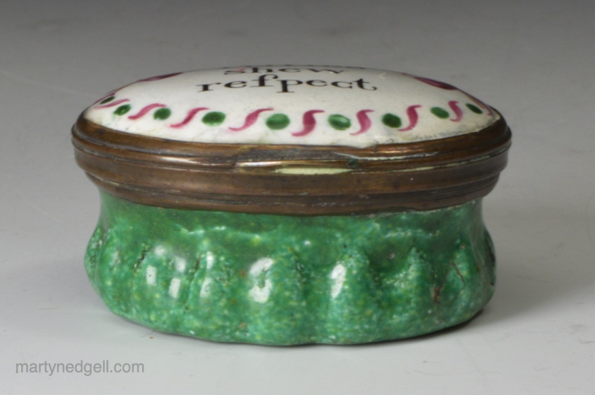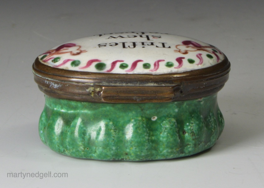 Bilston enamel patch box, circa 1780 ‘Trifles shew respect’