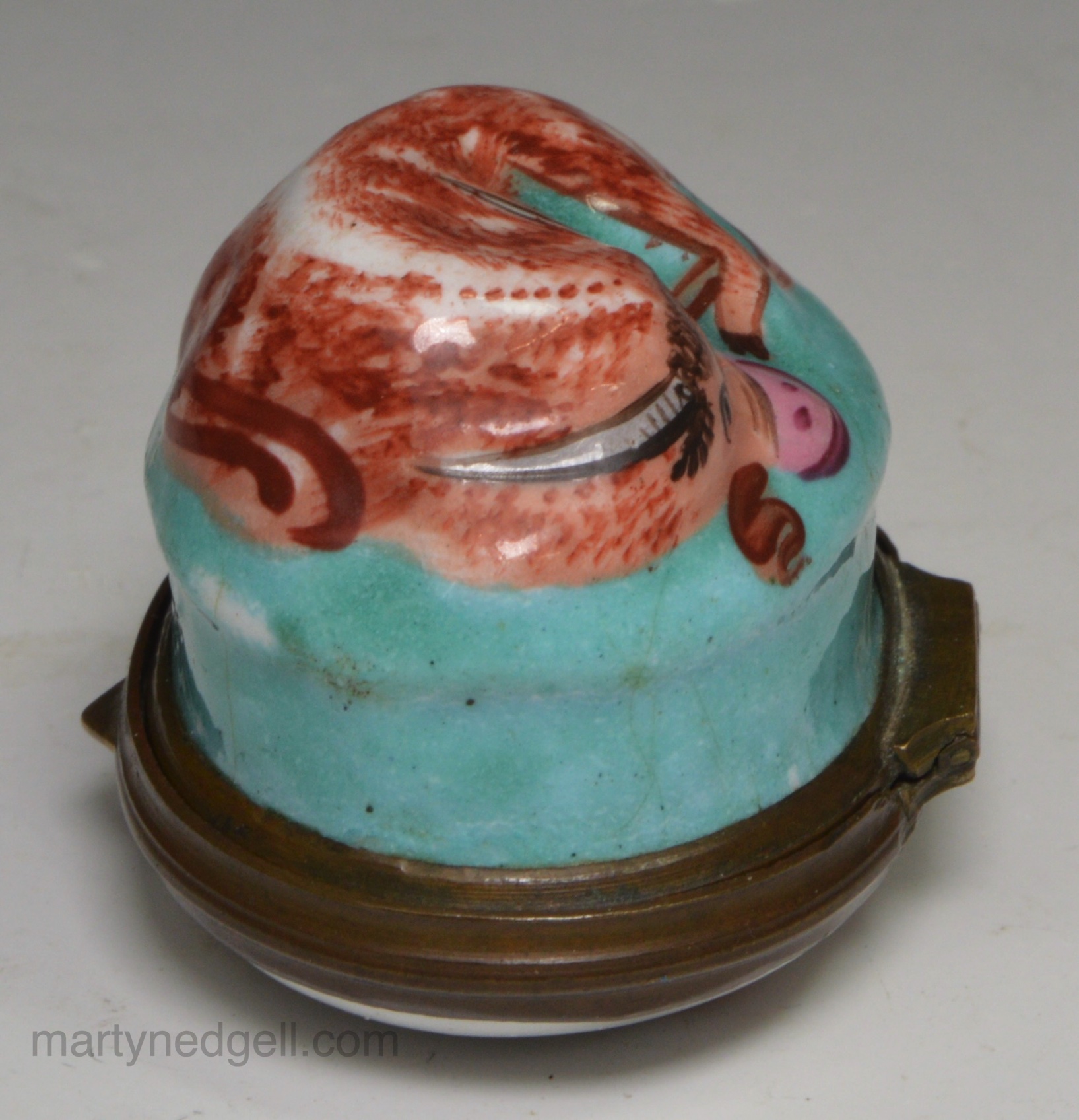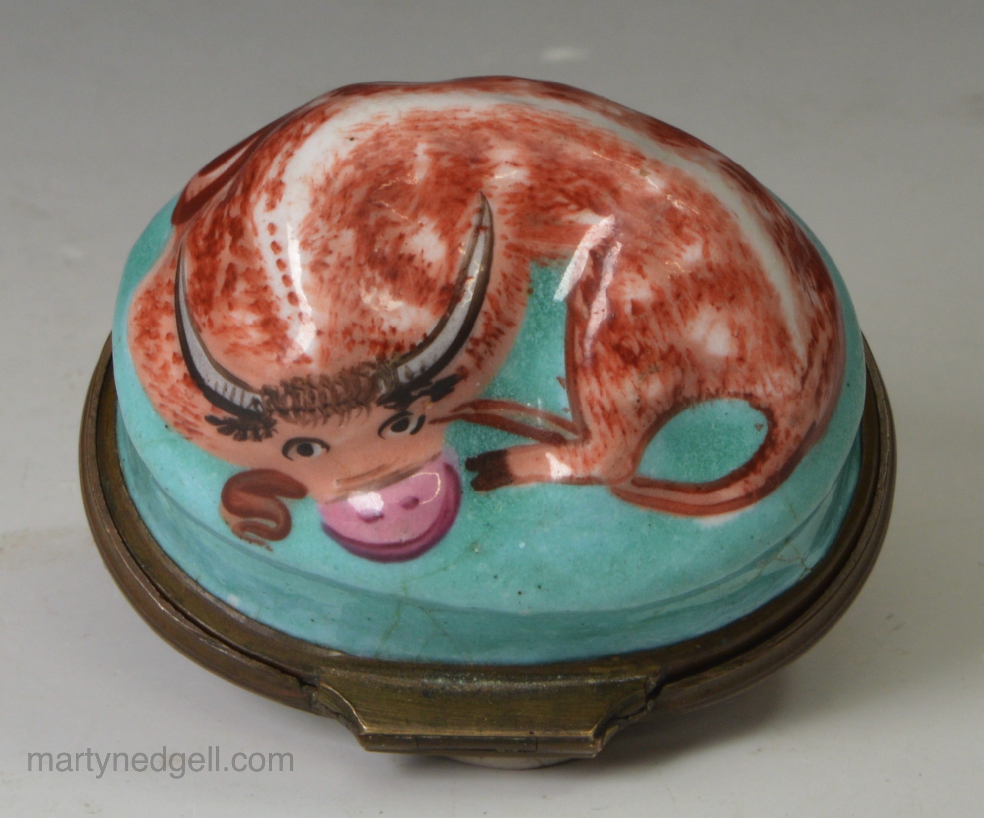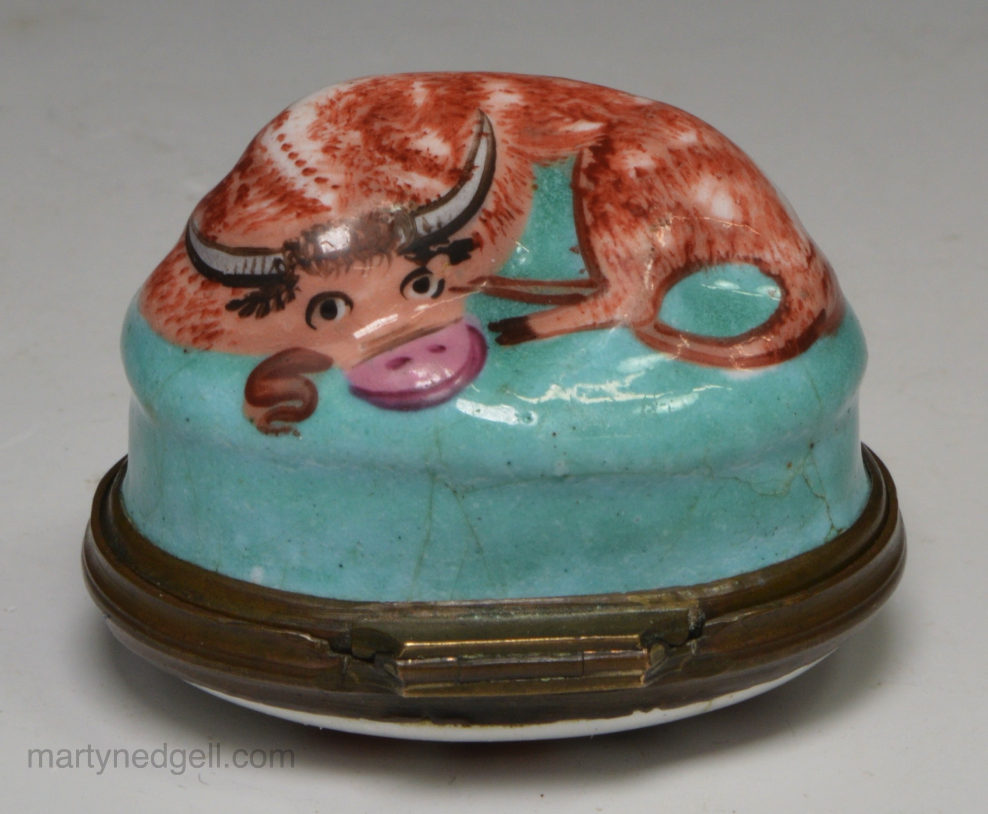 / Bilston enamel patch box moulded with a bull, circa 1780