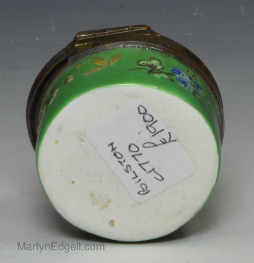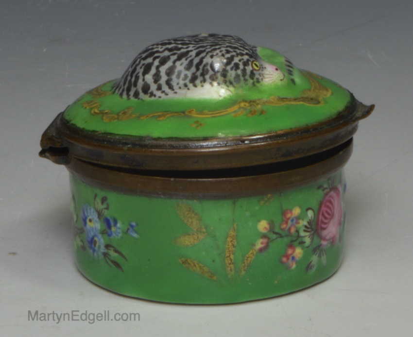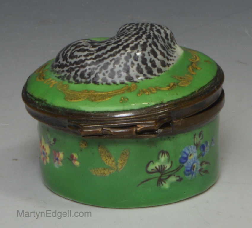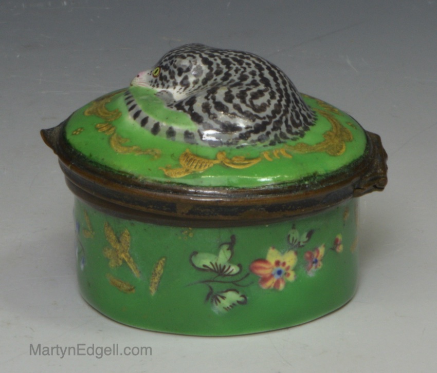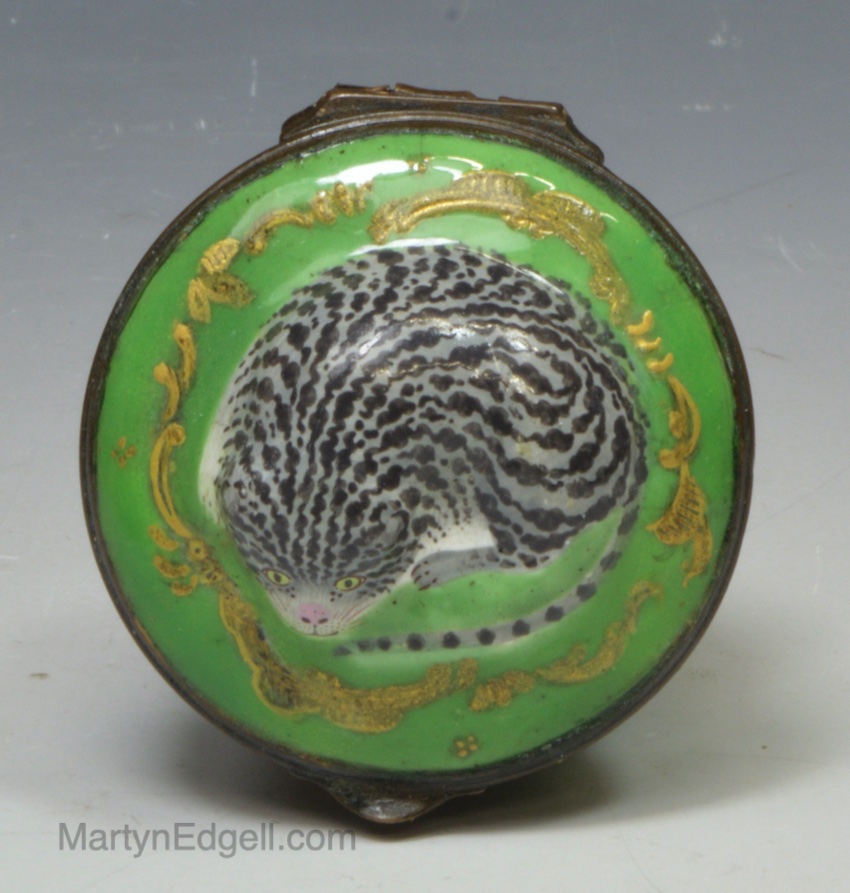 / Bilston enamel patch box moulded with a cat on the lid, circa 1770