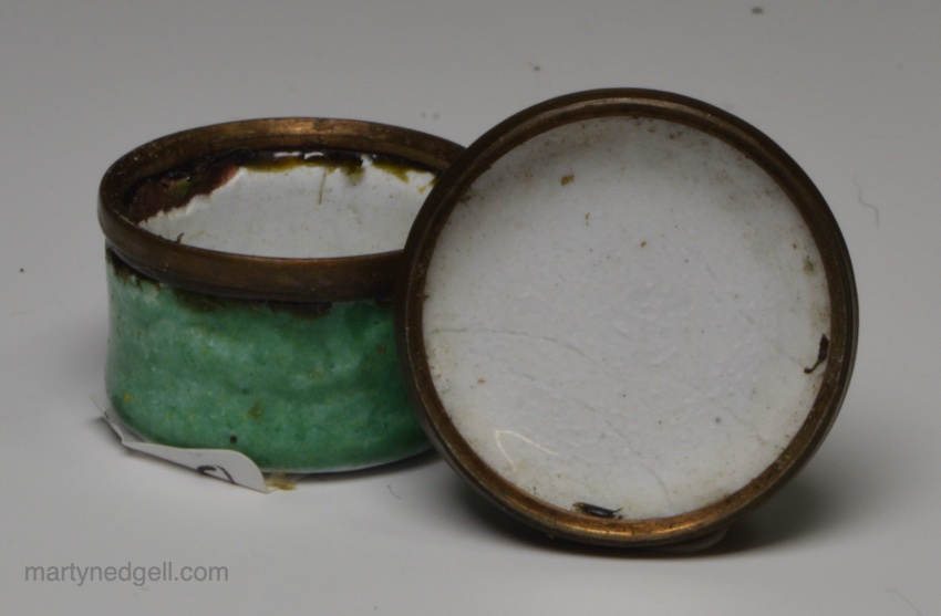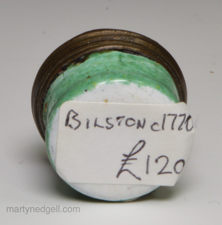 / Bilston enamel pill box ‘A Trifle from BARDFIELD’, circa 1770