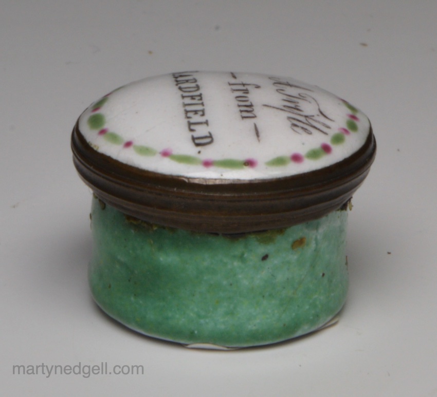 Bilston enamel pill box ‘A Trifle from BARDFIELD’, circa 1770