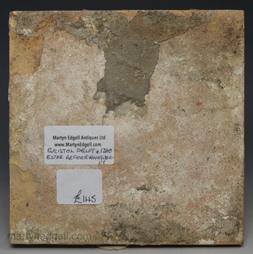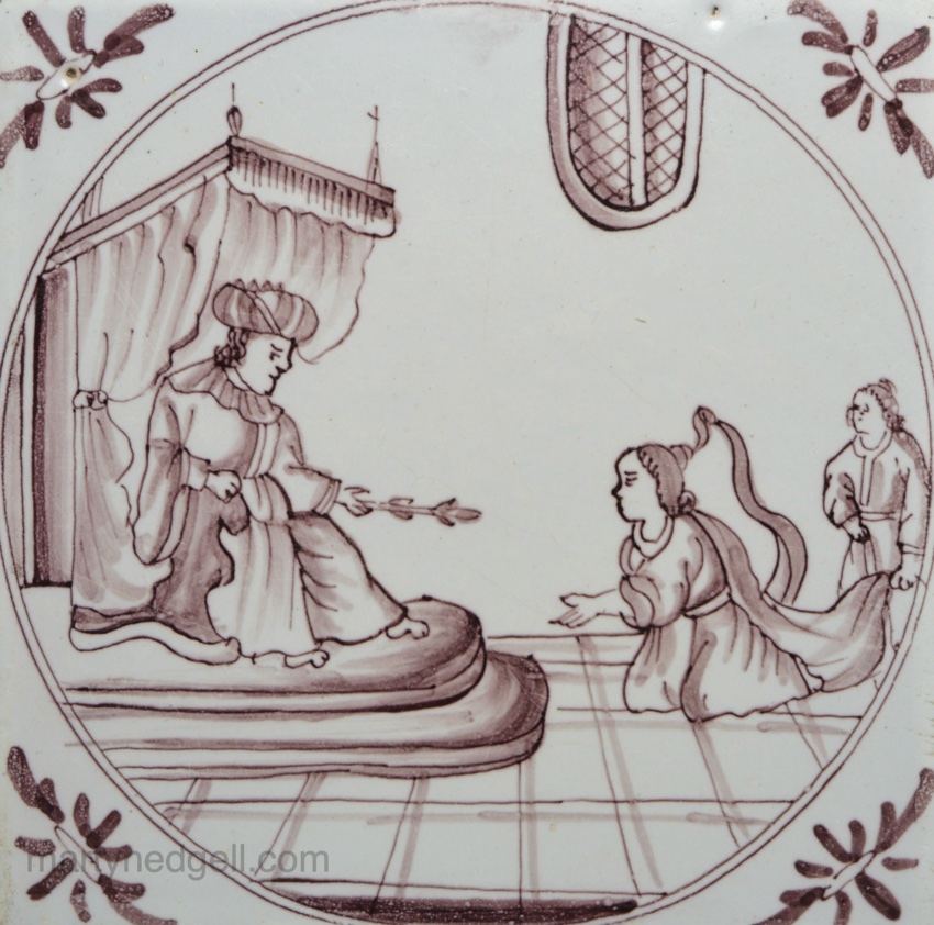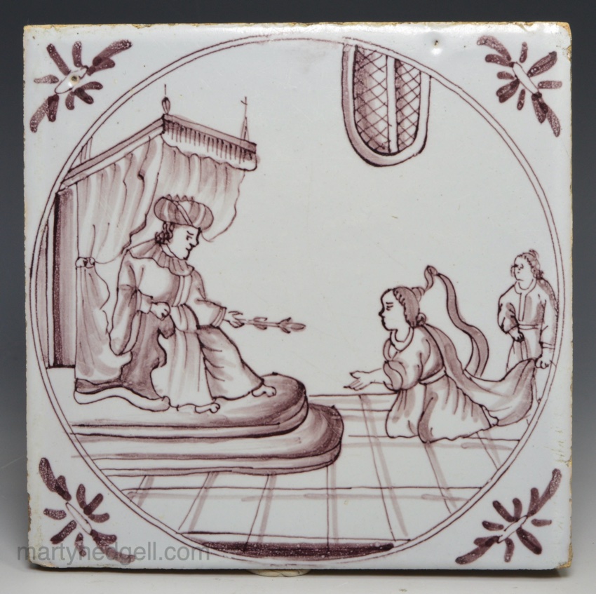 / Bristol delft biblical tile of Esther before Ahasuerus, circa 1740