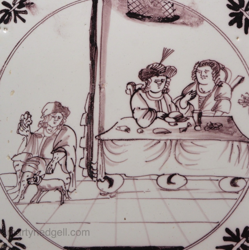 Bristol delft biblical tile, the rich man and Lazarus, circa 1750