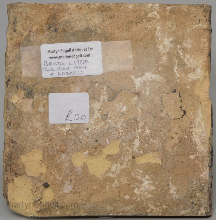 / Bristol delft biblical tile, the rich man and Lazarus, circa 1750