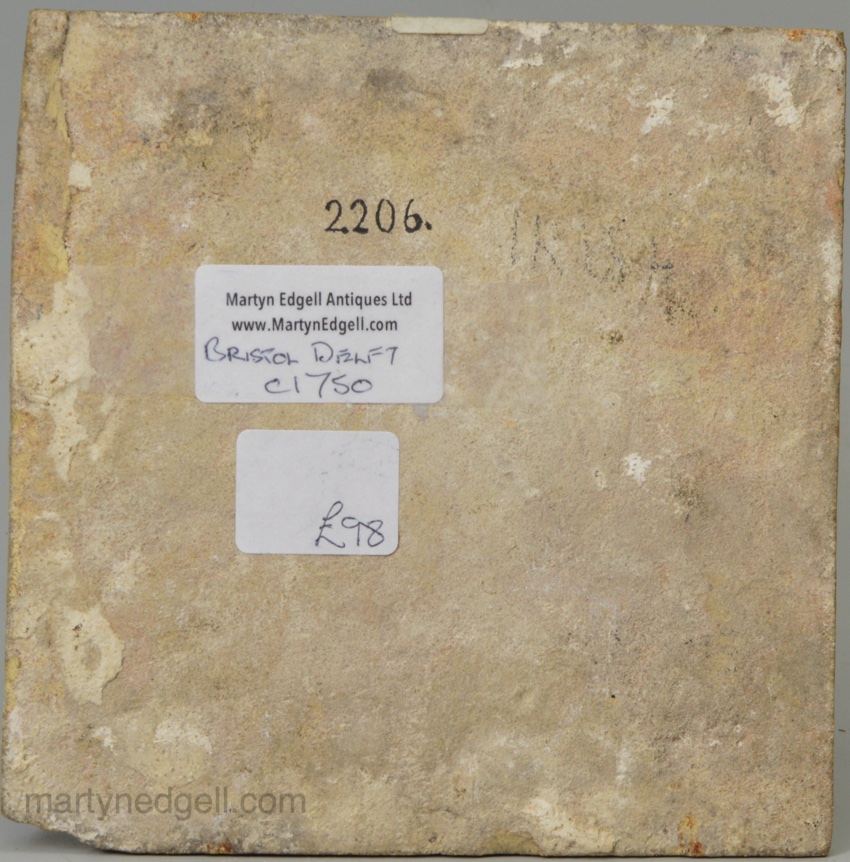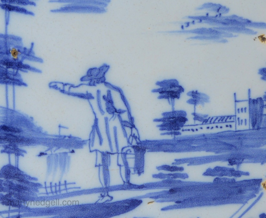 / Bristol delft tile decorated with a man carrying a bucket, circa 1750