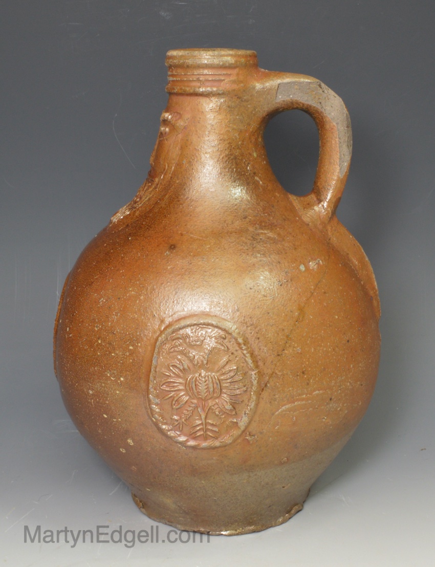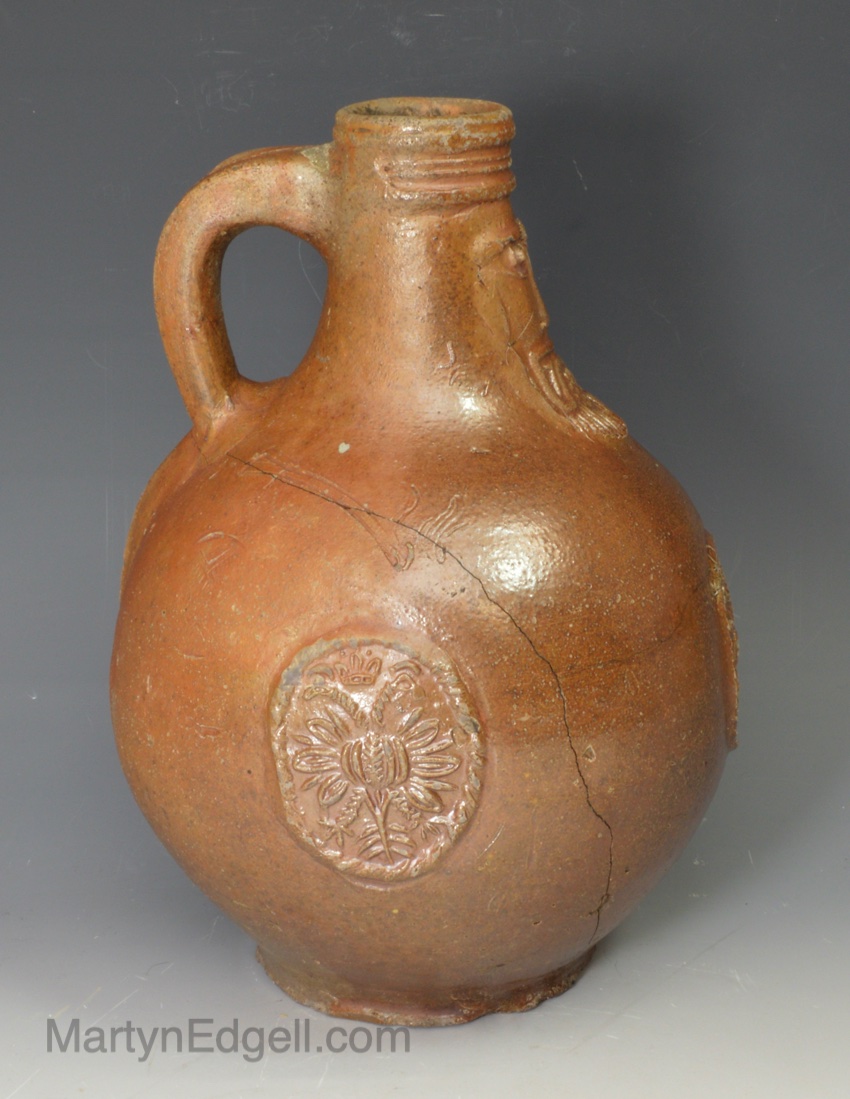 / German brown saltglaze stoneware bellarmine jug decorated with a spread eagle, circa 1600