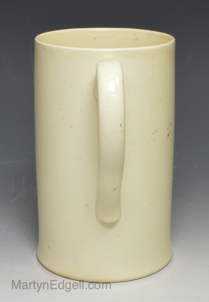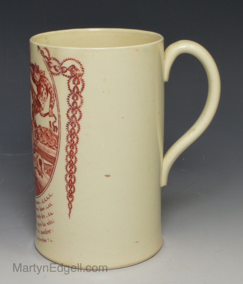 / Creamware mug decorated with a humorous print in red (Merry Andrew), circa 1780