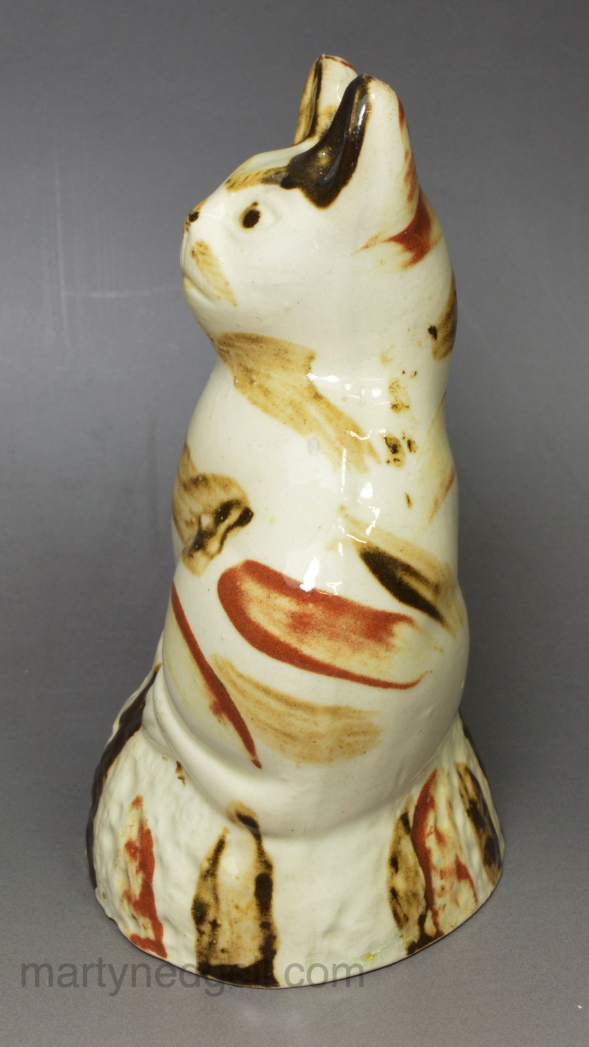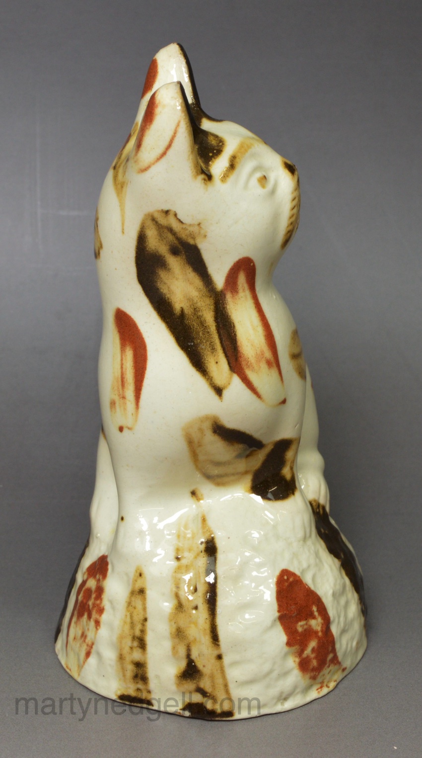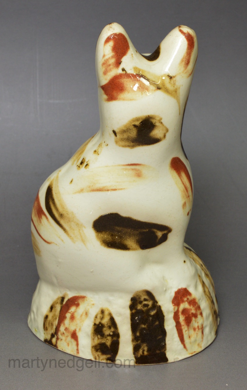 / Creamware pottery cat decorated with splashes of slip, circa 1790, probably Bovey Tracey Pottery