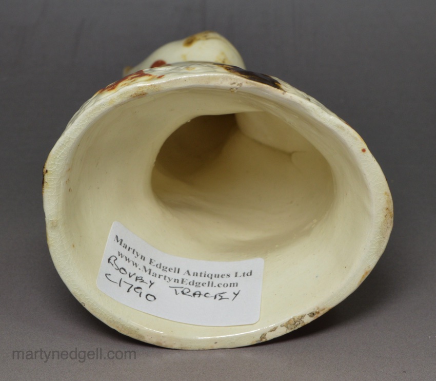 Creamware pottery cat decorated with splashes of slip, circa 1790, probably Bovey Tracey Pottery
