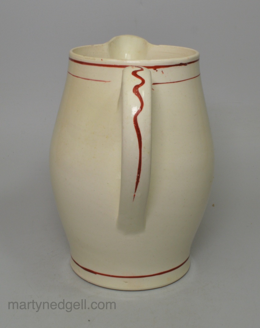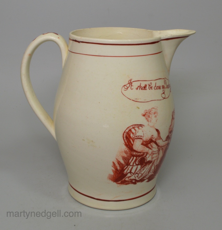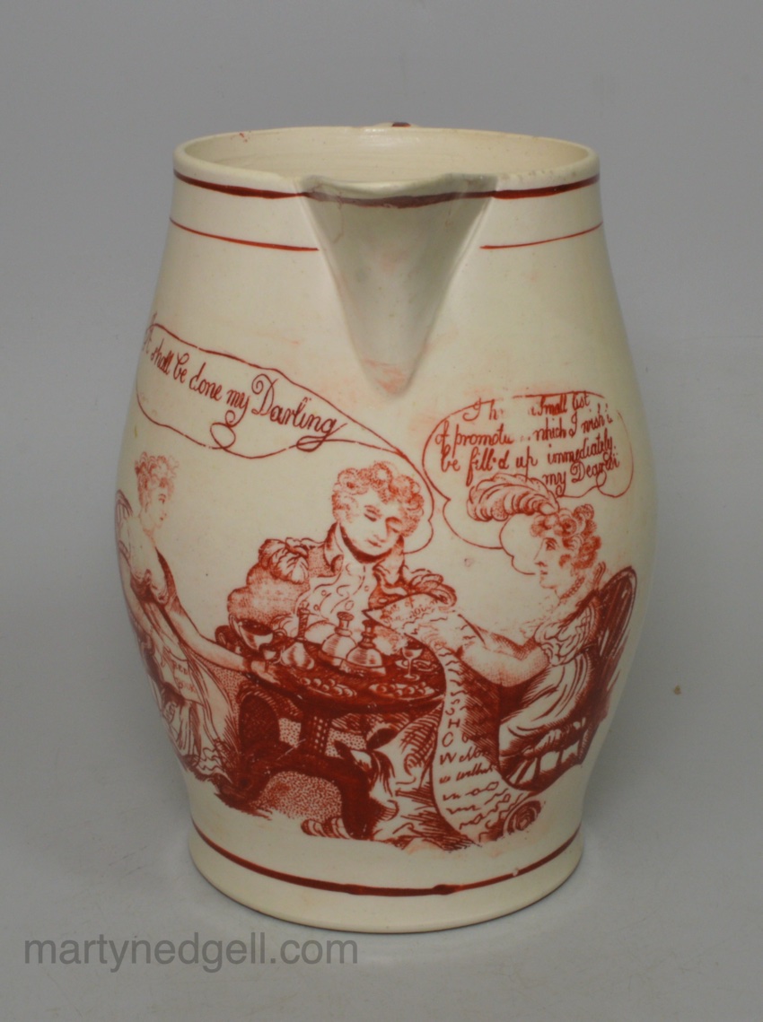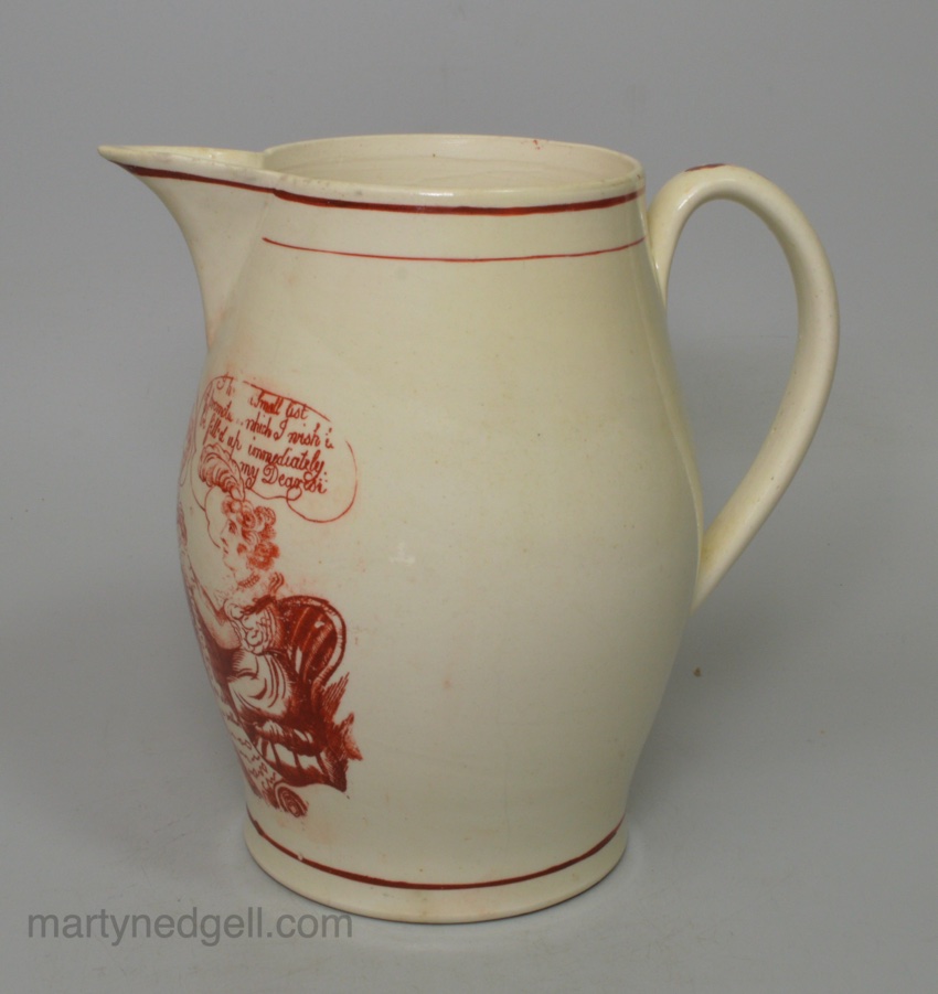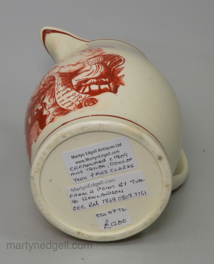 Creamware pottery jug with a print lampooning the Duke of York and Mrs. Clarke, circa 1809
