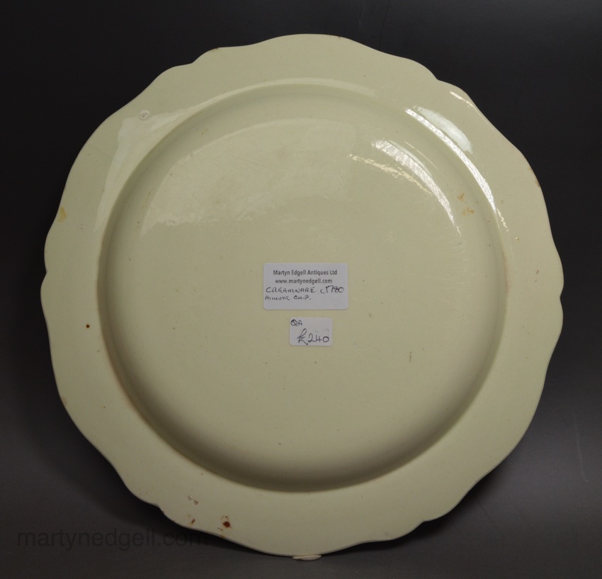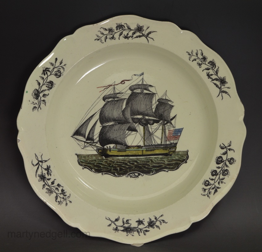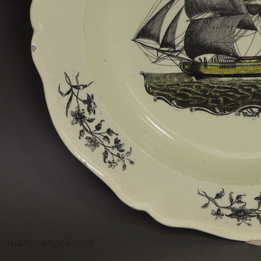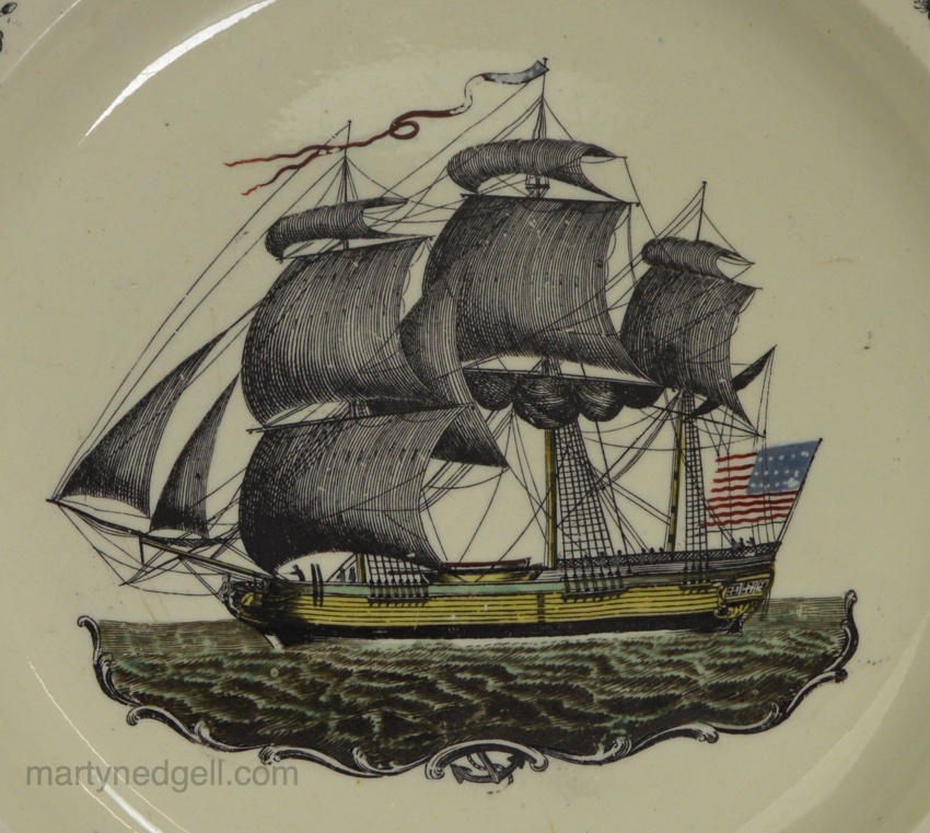 / Creamware pottery plate decorated with a print of an American ship, circa 1780, probably Liverpool Pottery