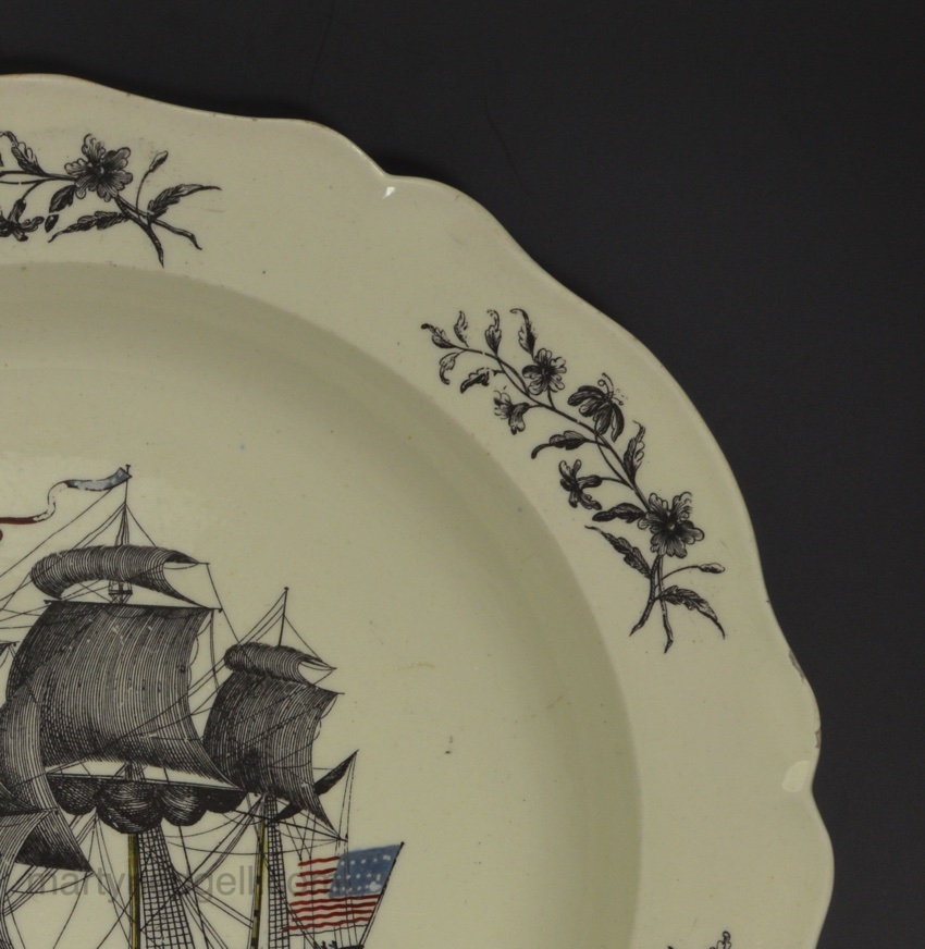 Creamware pottery plate decorated with a print of an American ship, circa 1780, probably Liverpool Pottery