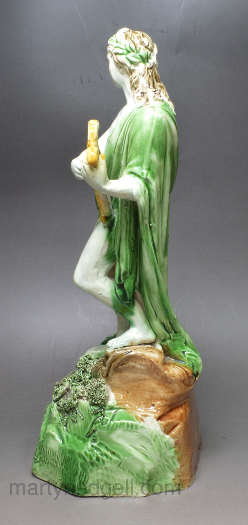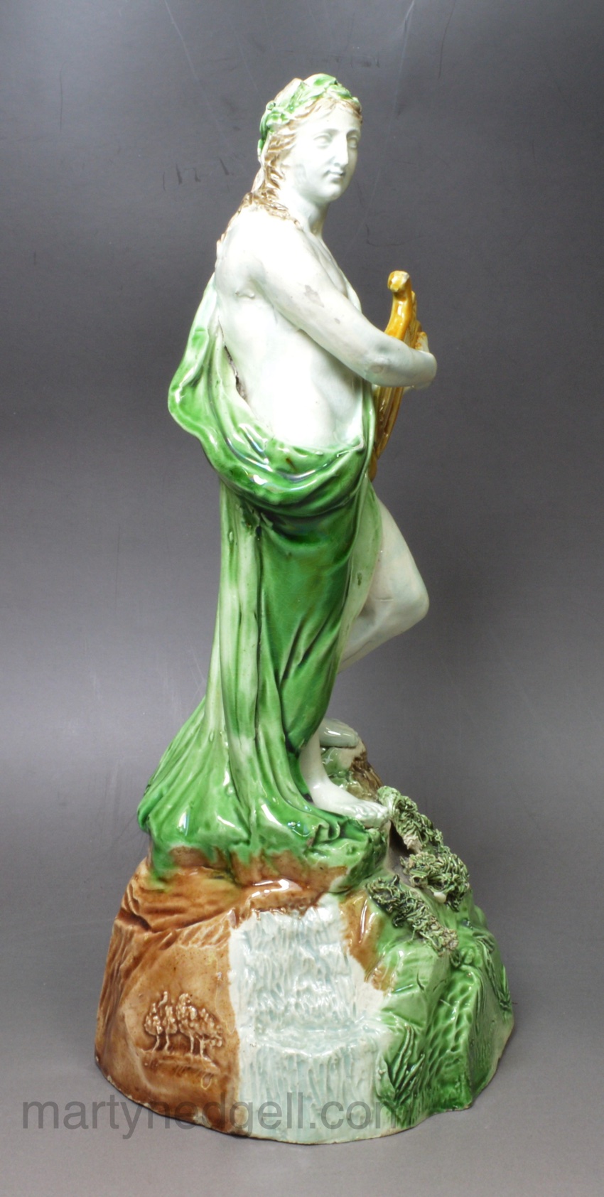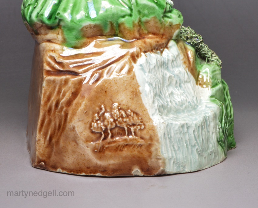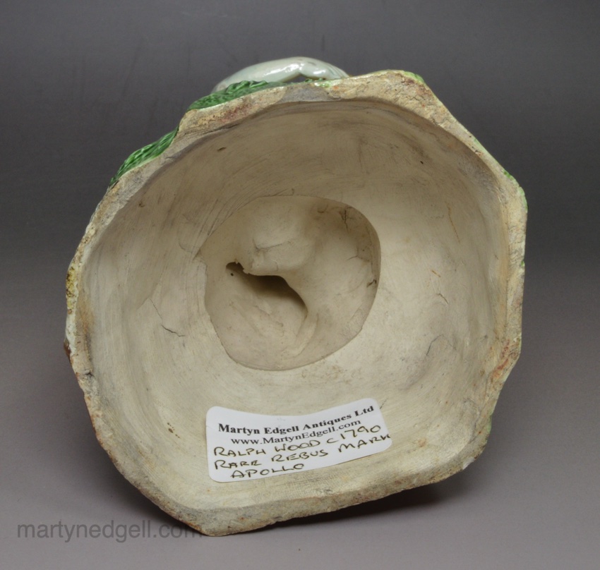 This figure has the rare Wood rebus mark, see picture, that has been associated as the mark of one of the Wood family members potting at this time. See Mark 4281 in Godden’s book on marks. This figure has all the quality too be attributed to Ralph Wood though there needs more research into these figures to be sure.