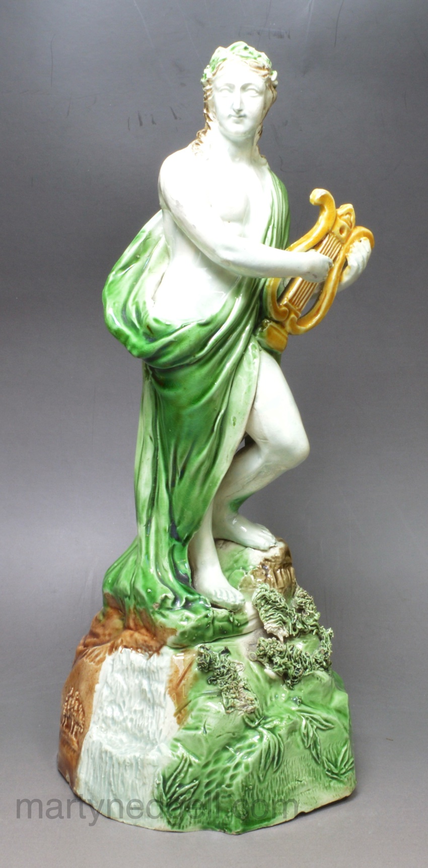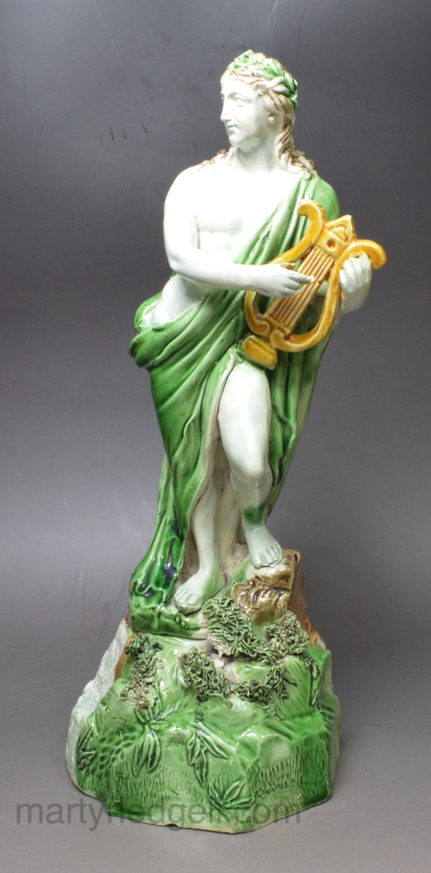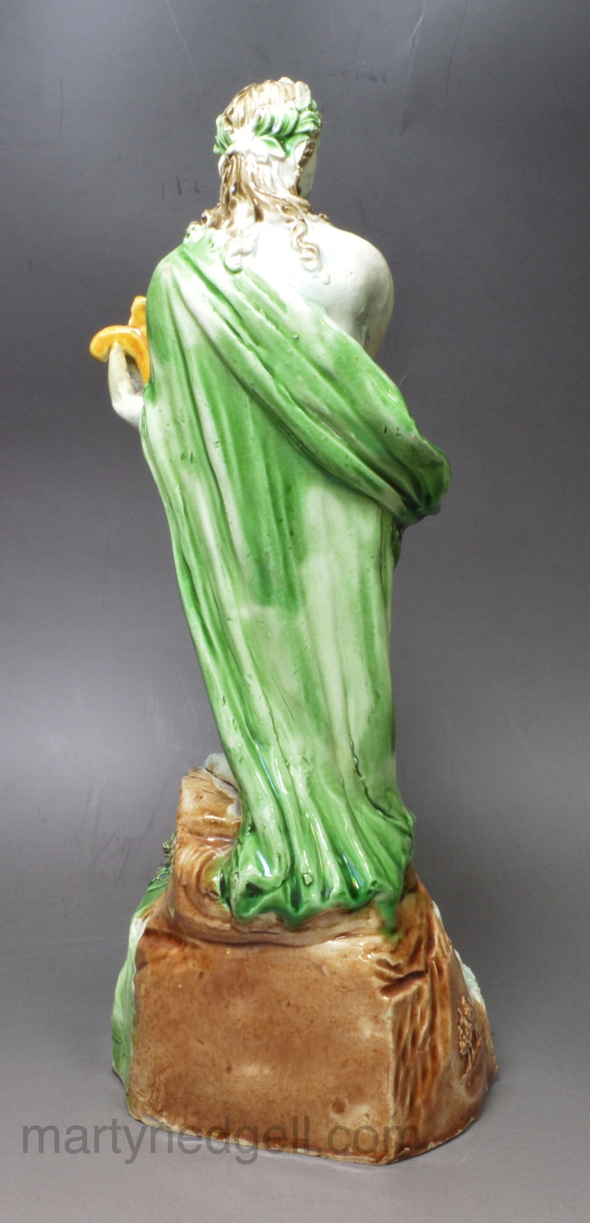 This figure has the rare Wood rebus mark, see picture, that has been associated as the mark of one of the Wood family members potting at this time. See Mark 4281 in Godden’s book on marks. This figure has all the quality too be attributed to Ralph Wood though there needs more research into these figures to be sure.