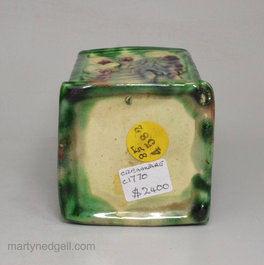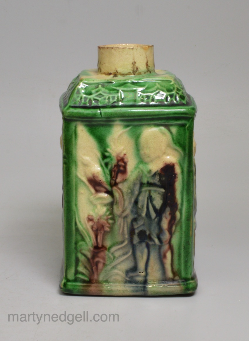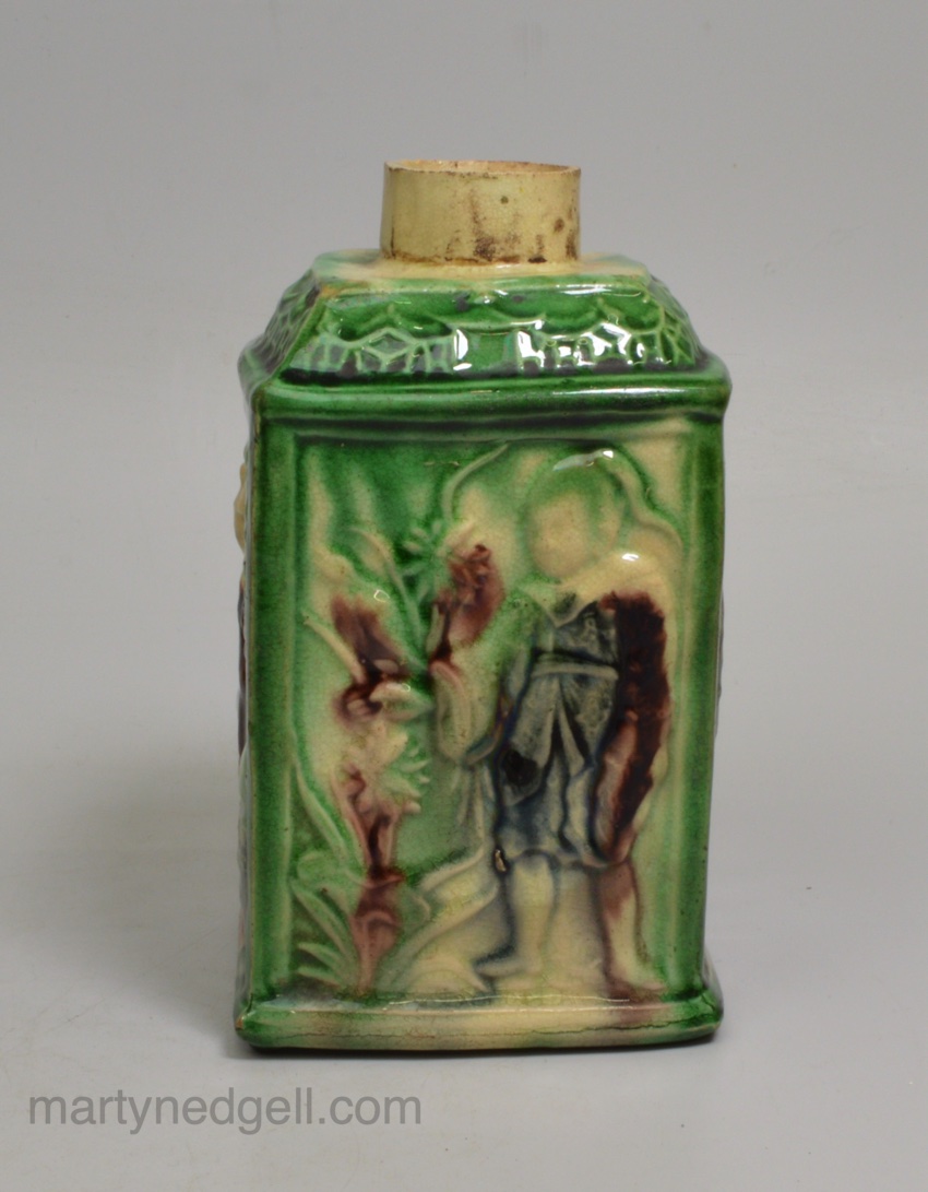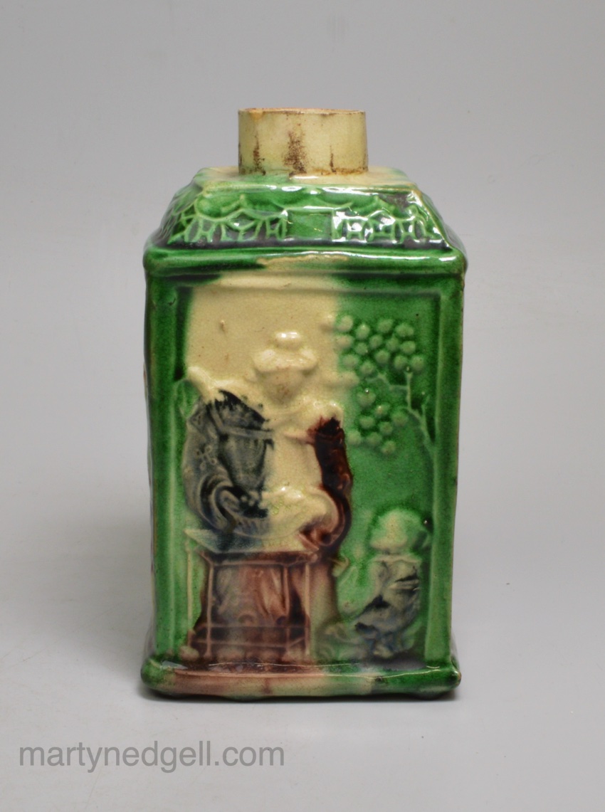 Creamware pottery tea canister moulded with Chinese subjects and decorated with colour under the glaze, circa 1770