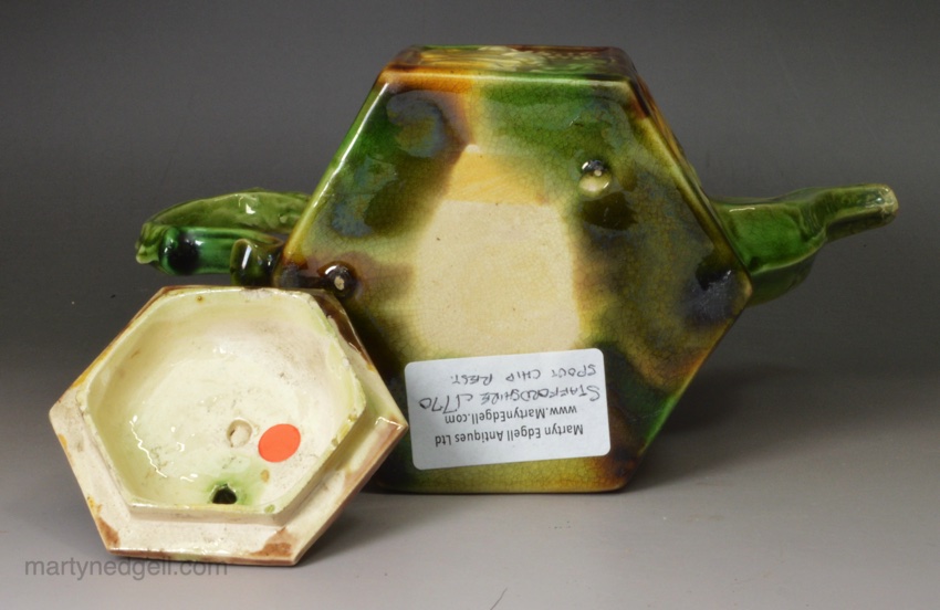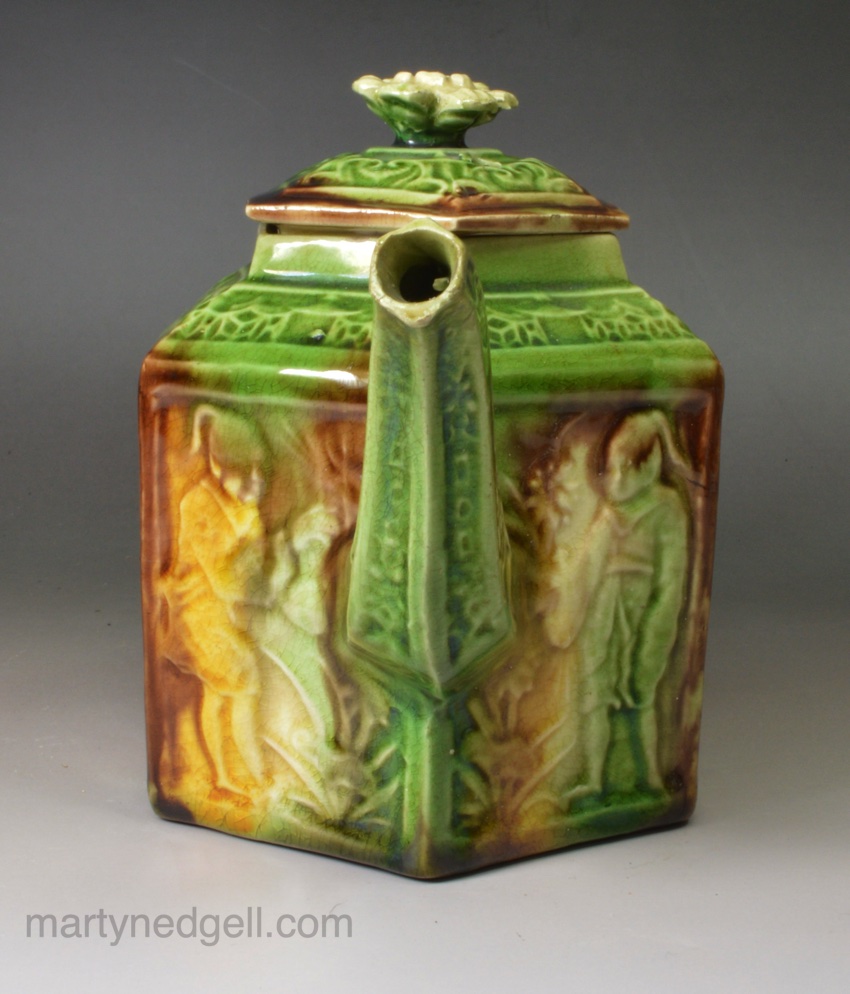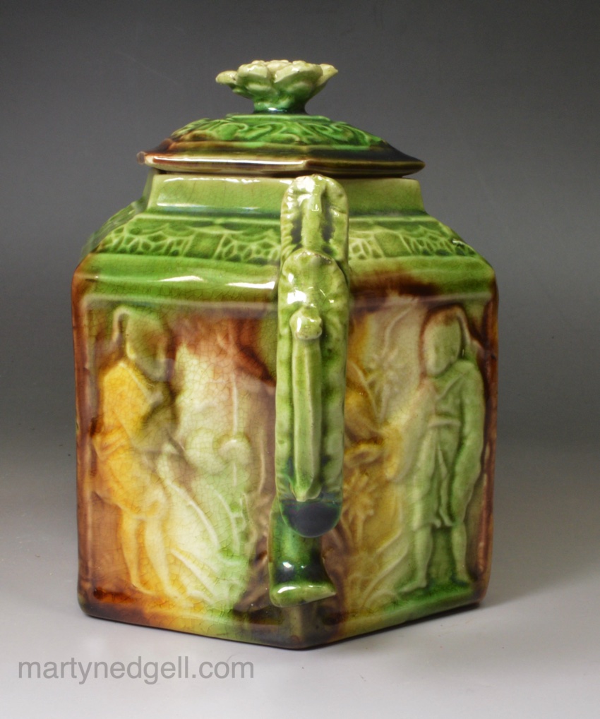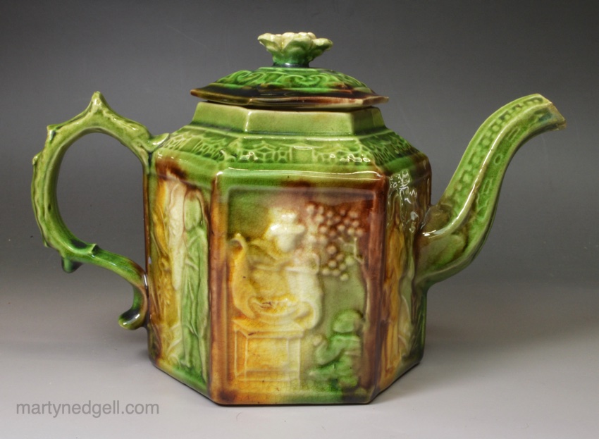/ Creamware pottery teapot moulded with Chinoiserie panels and coloured under the glaze, circa 1770