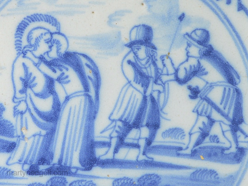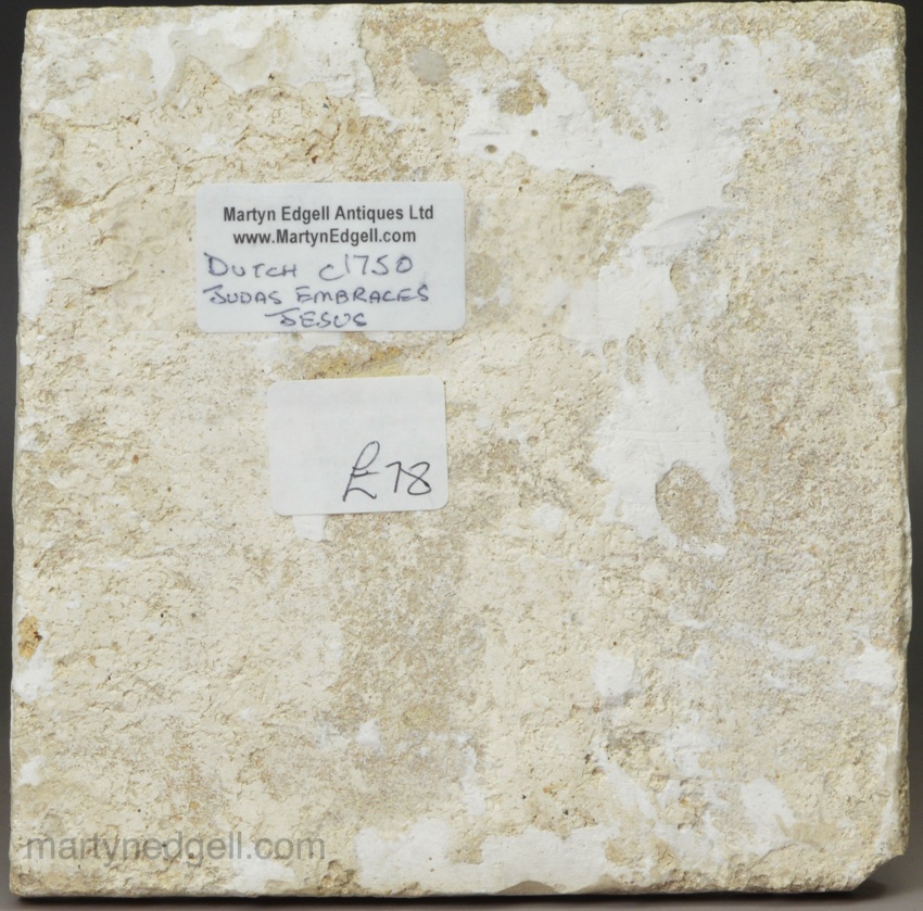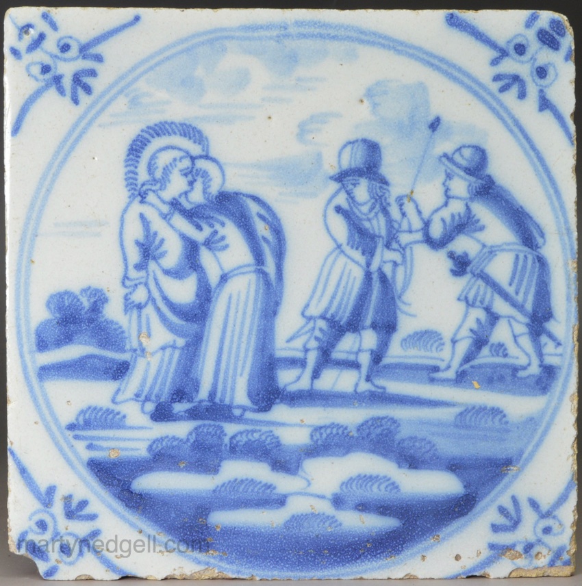 / Dutch Delft biblical tile, circa 1750, Judas embraces Jesus