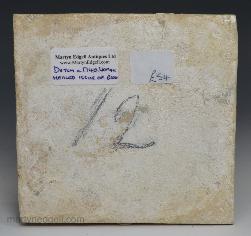 Dutch Delft biblical tile of a Woman healed with the issue of blood, circa 1740