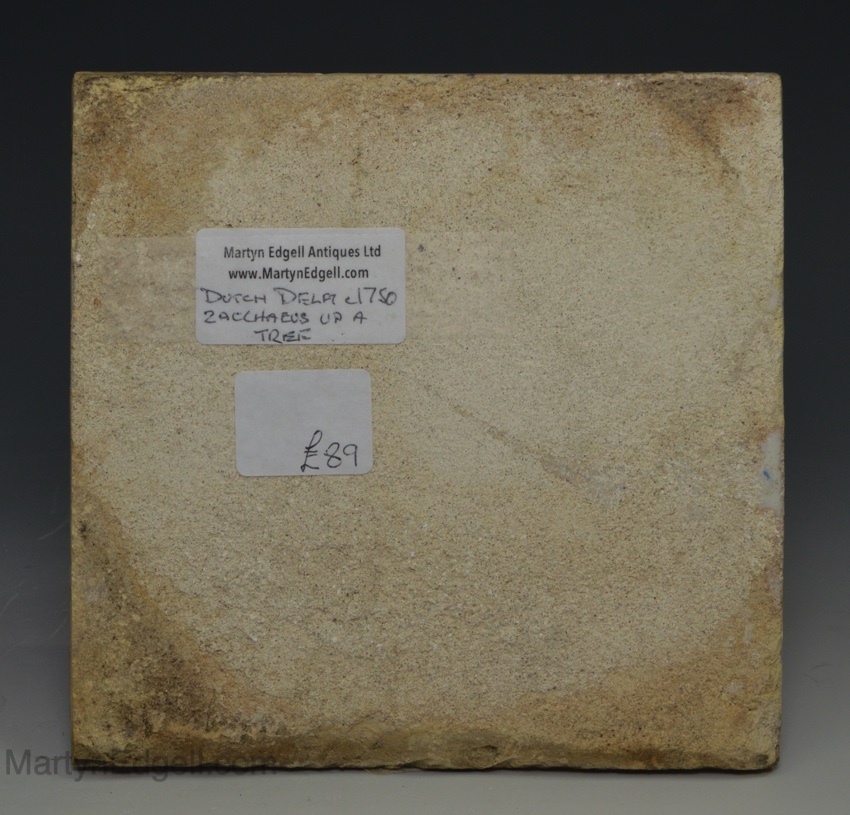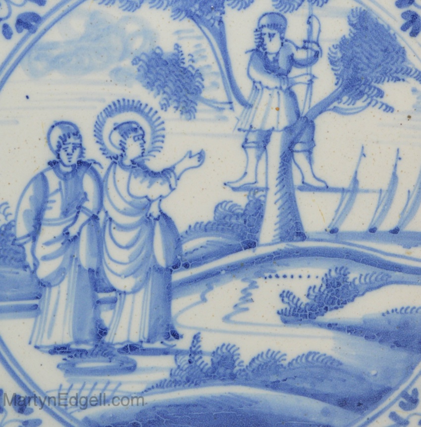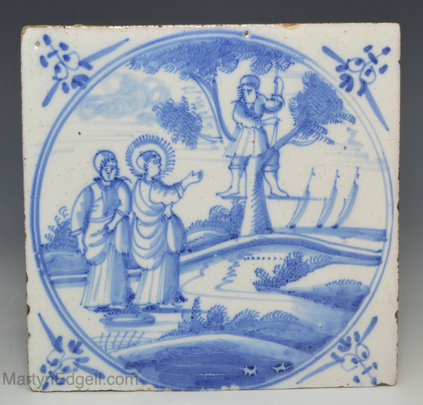 Dutch Delft biblical tile of Jacchaeus up a tree, circa 1750