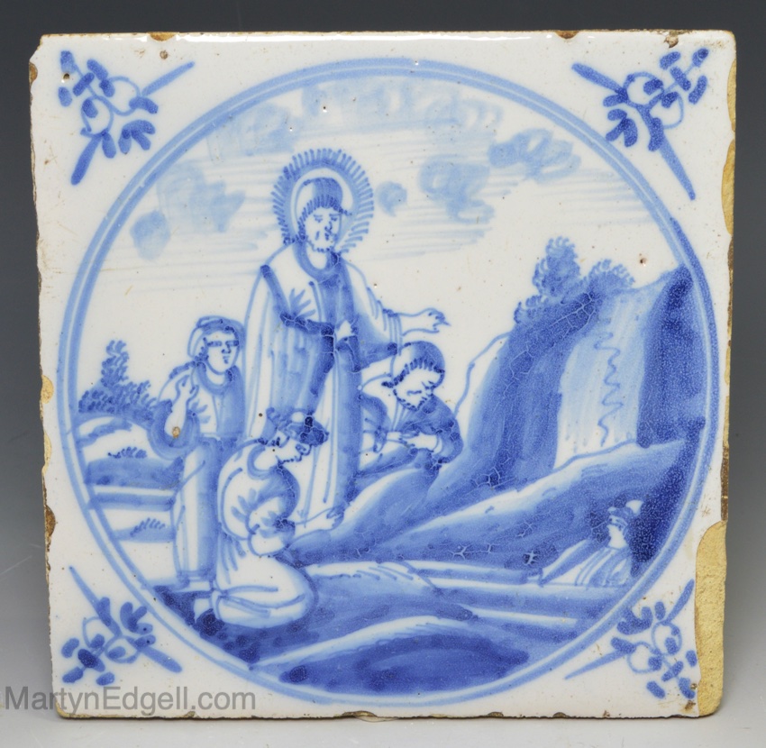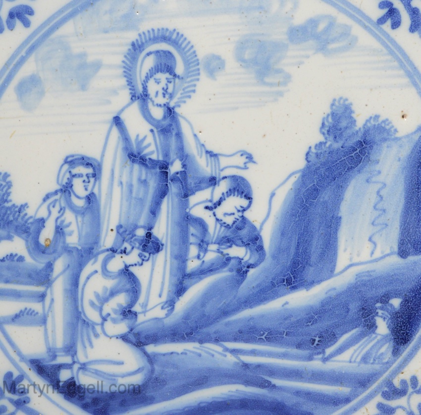 Dutch Delft biblical tile of Moses getting water from a rock, circa 1750