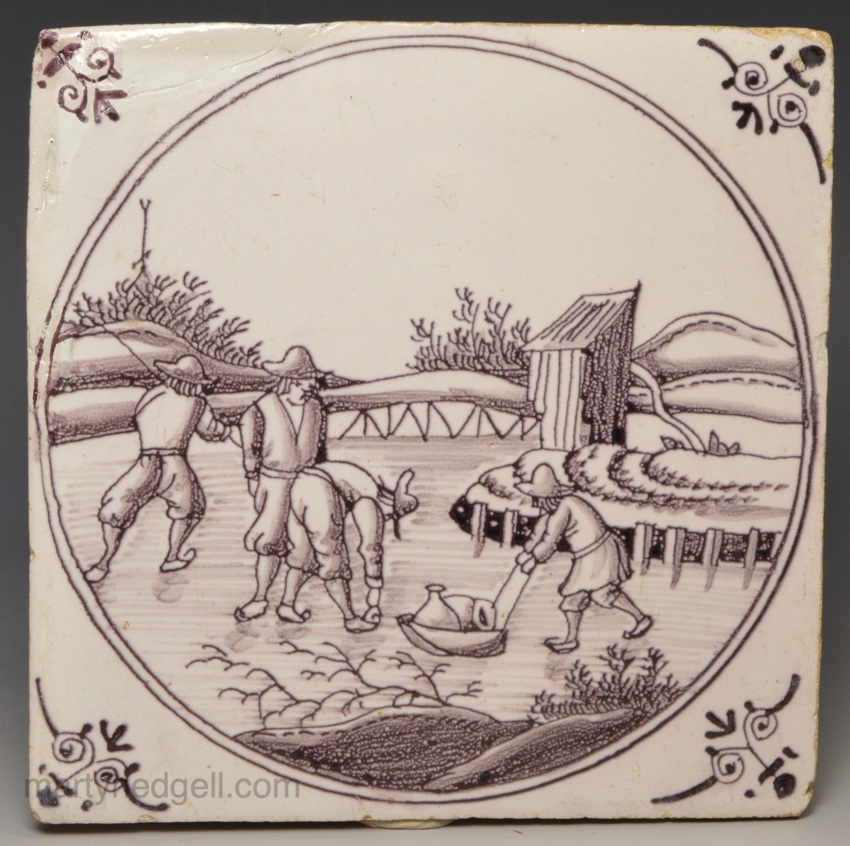 / Dutch Delft tile decorated with a farming scene, circa 1740