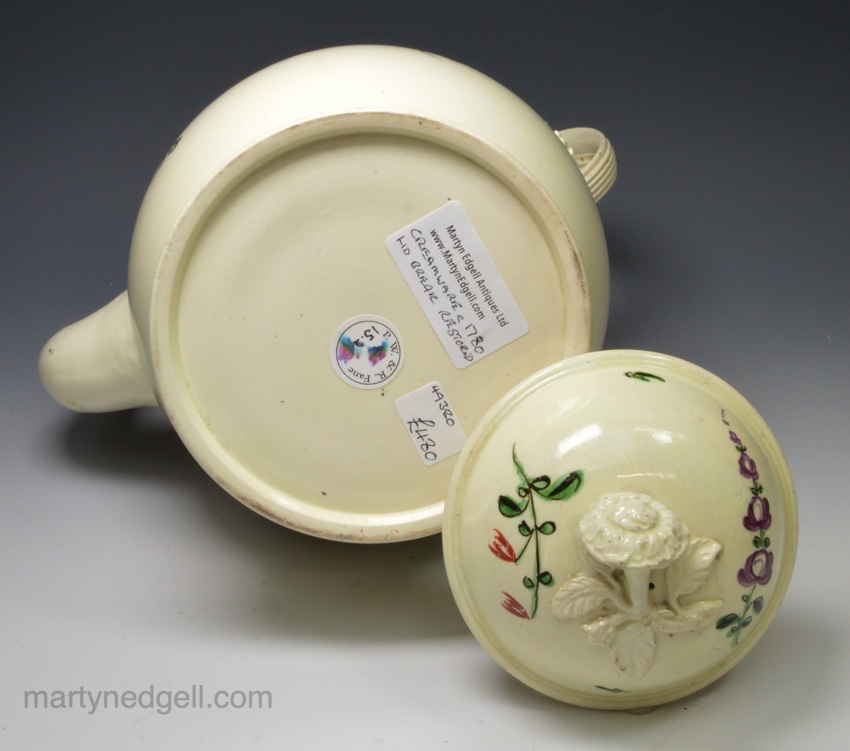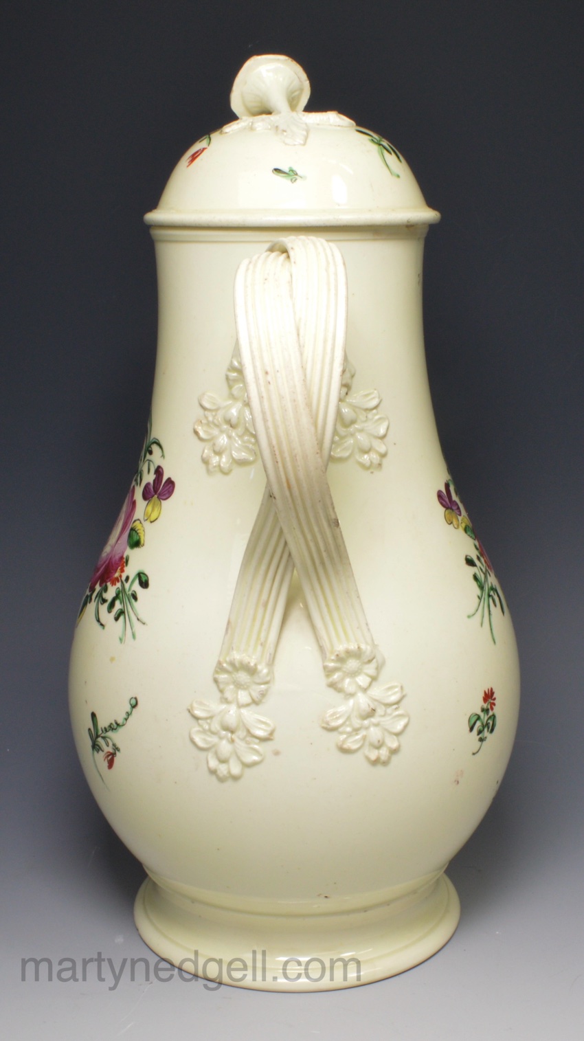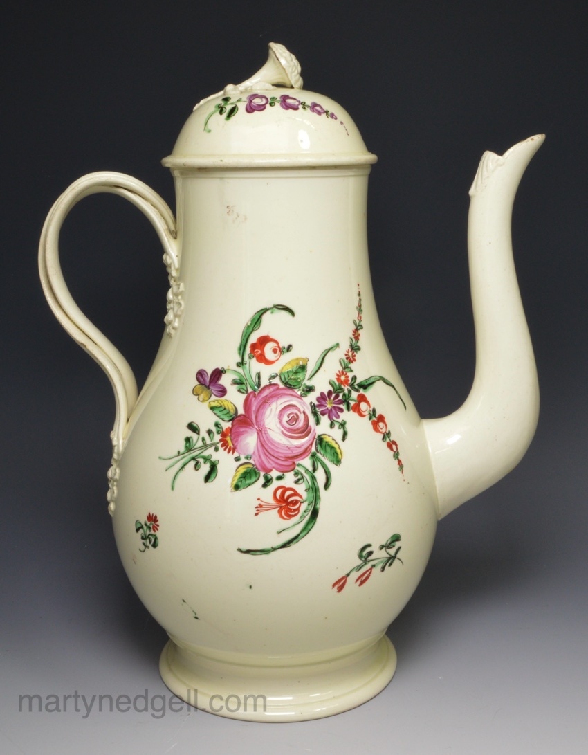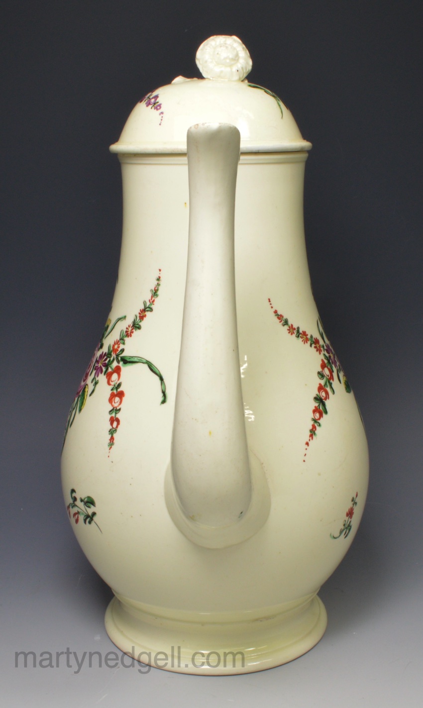Large creamware pottery coffee pot decorated with floral enamels over the glaze, circa 1780