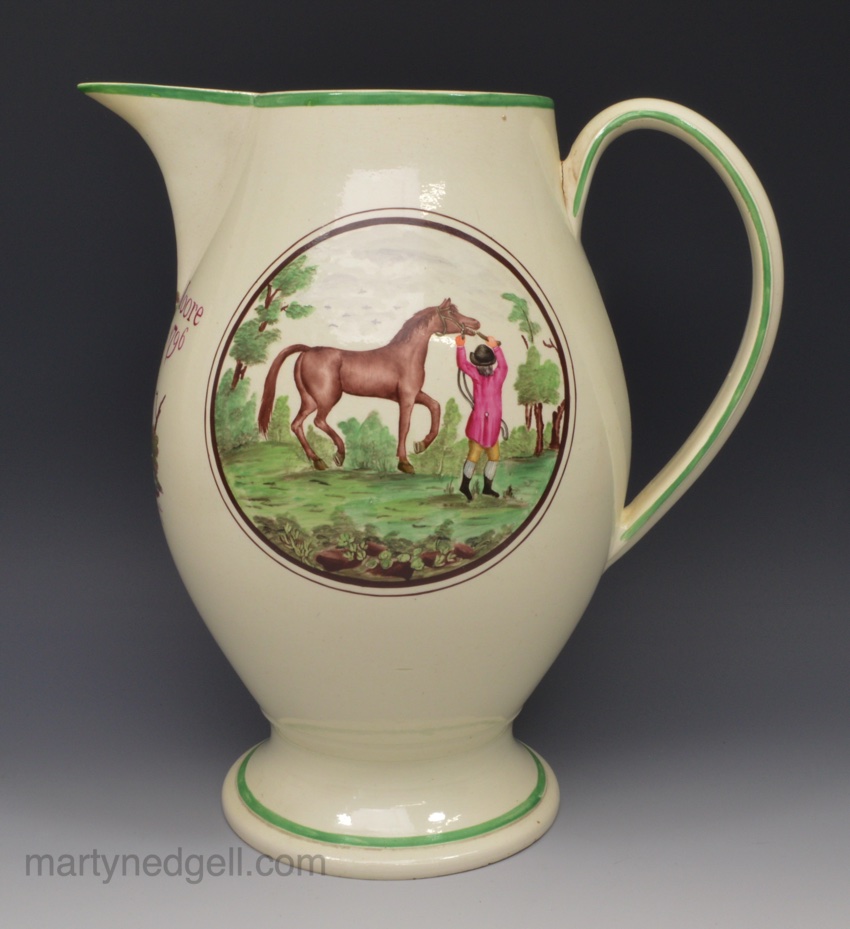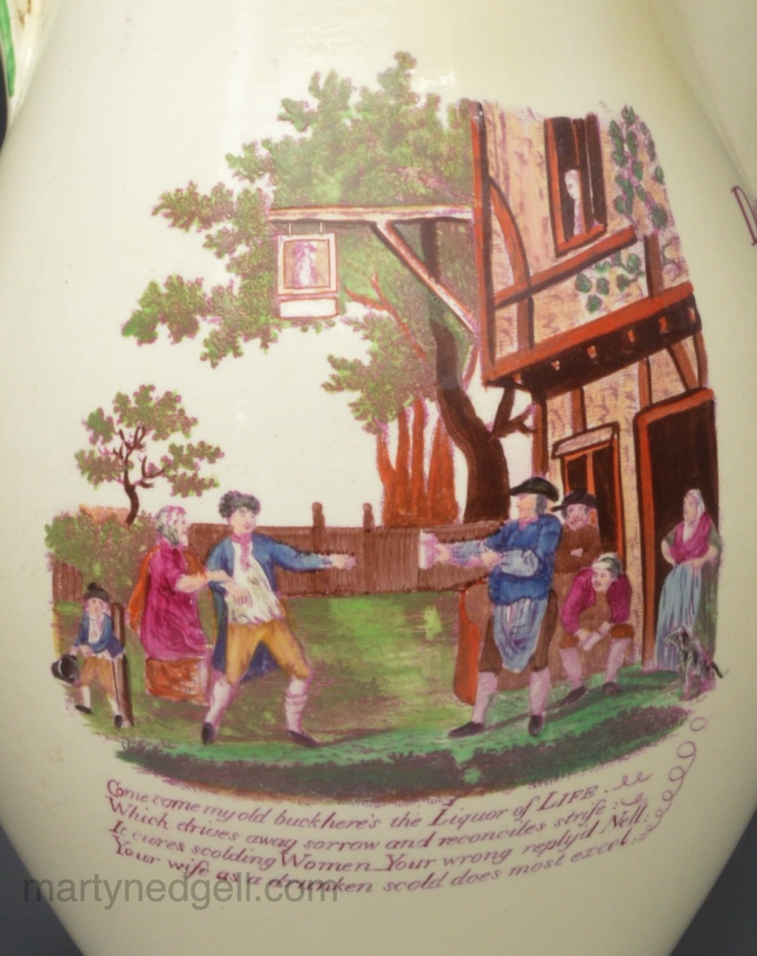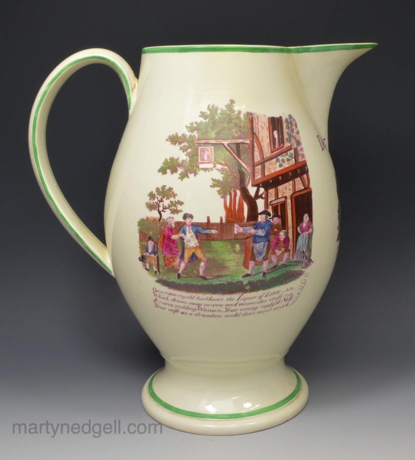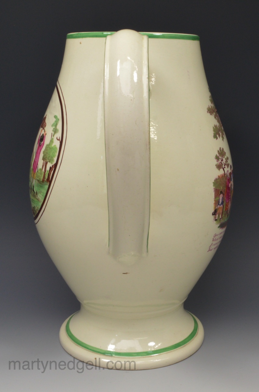 Large creamware pottery jug, Doctor Moore 1796 decorated with overglaze enamels and prints