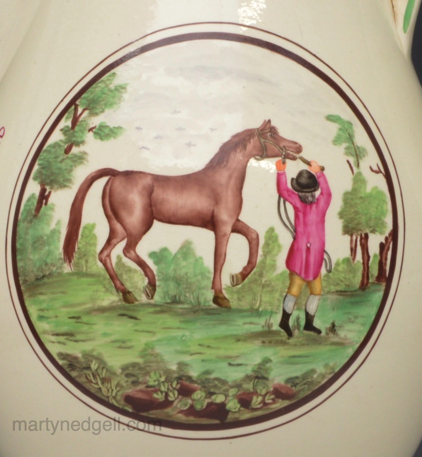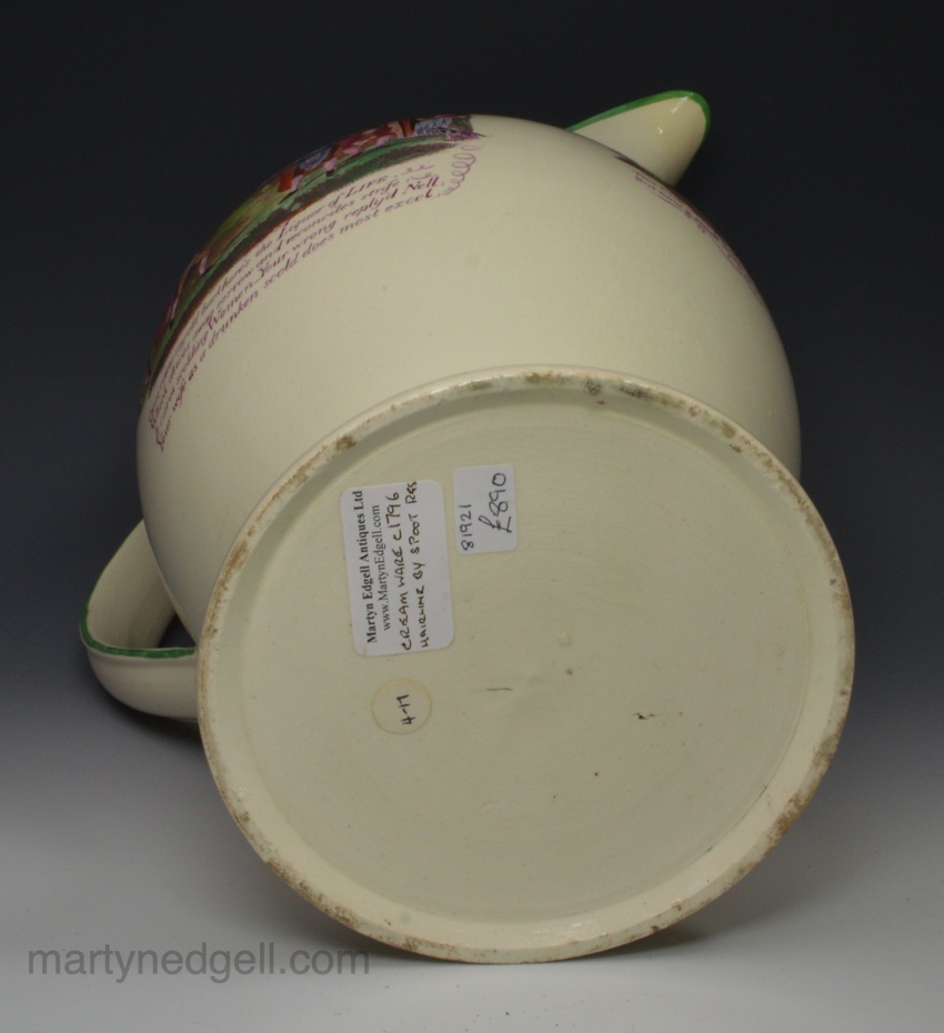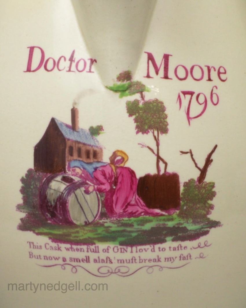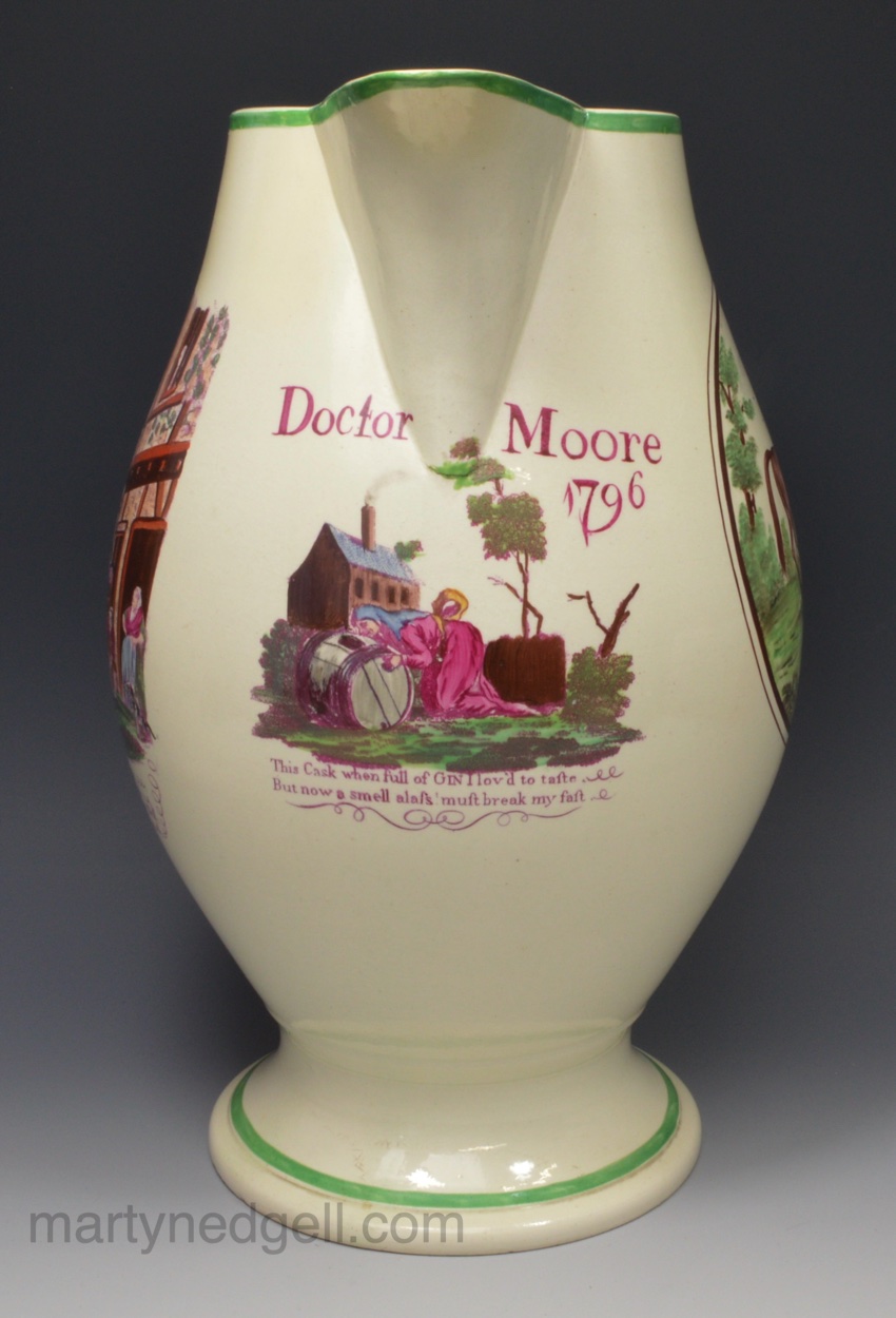 / Large creamware pottery jug, Doctor Moore 1796 decorated with overglaze enamels and prints