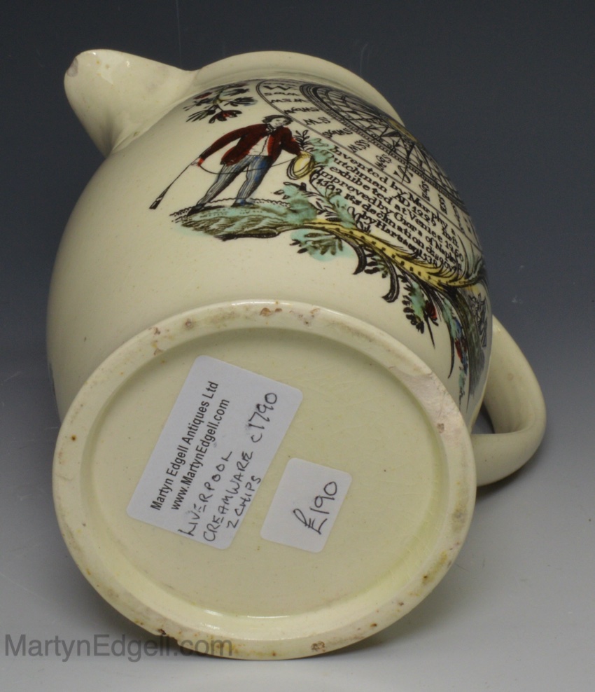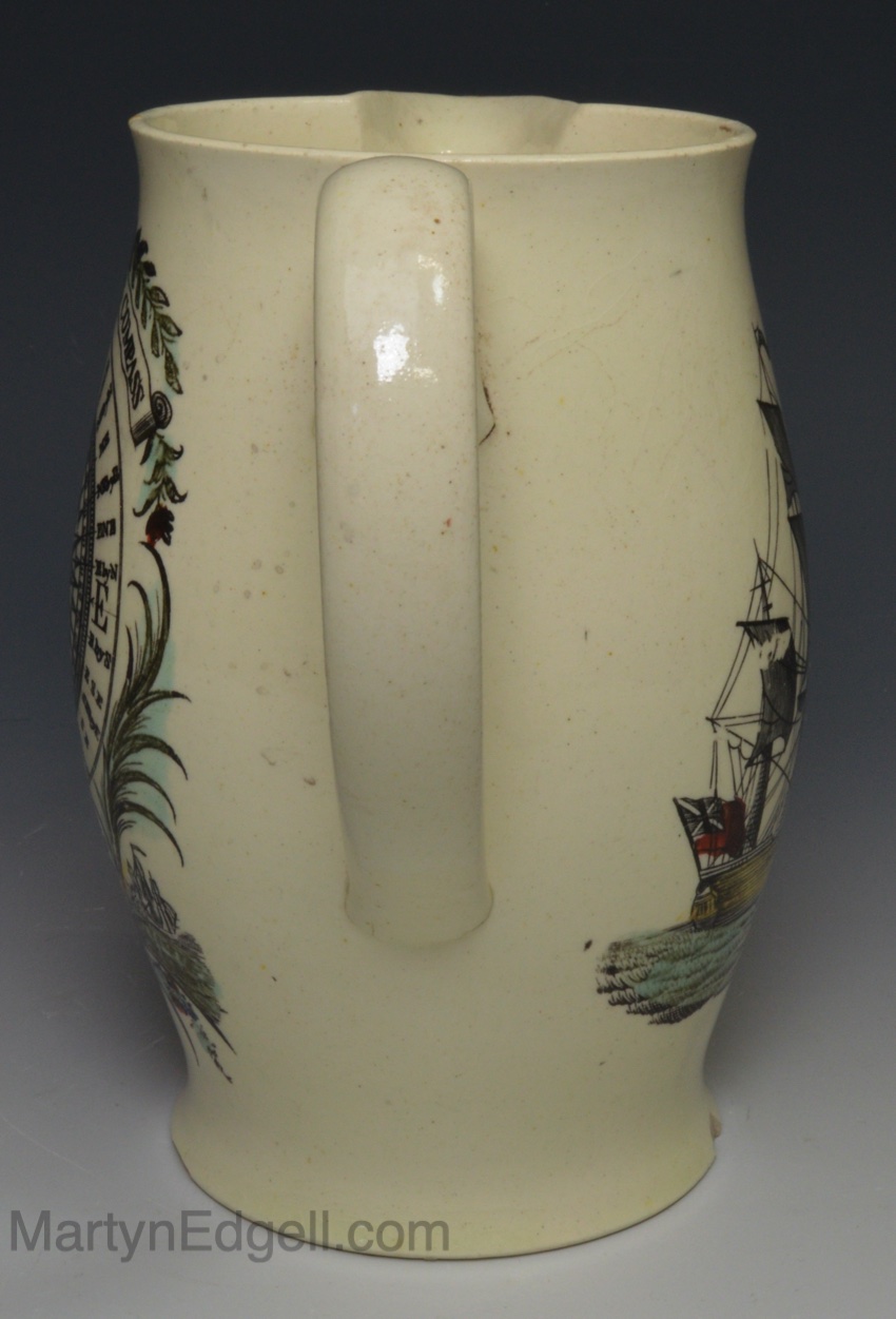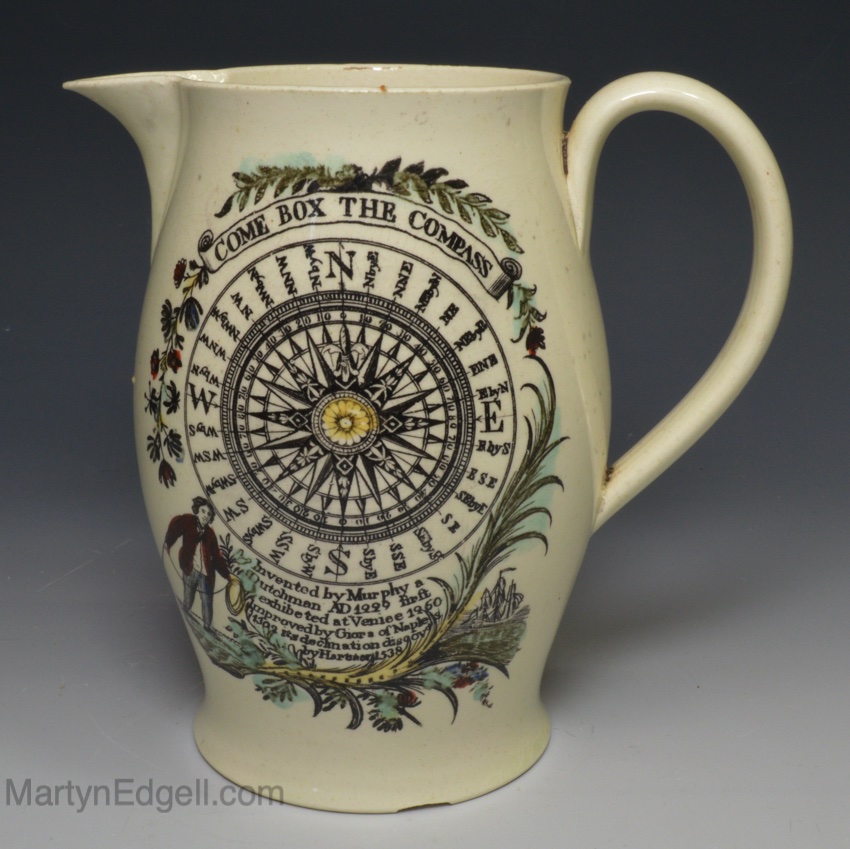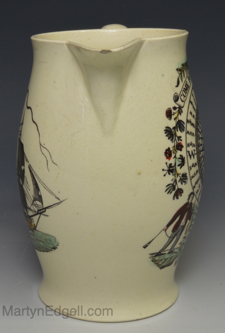 Liverpool creamware jug decorated with a print of a ship and ‘Come Box the Compass’, circa 1790
