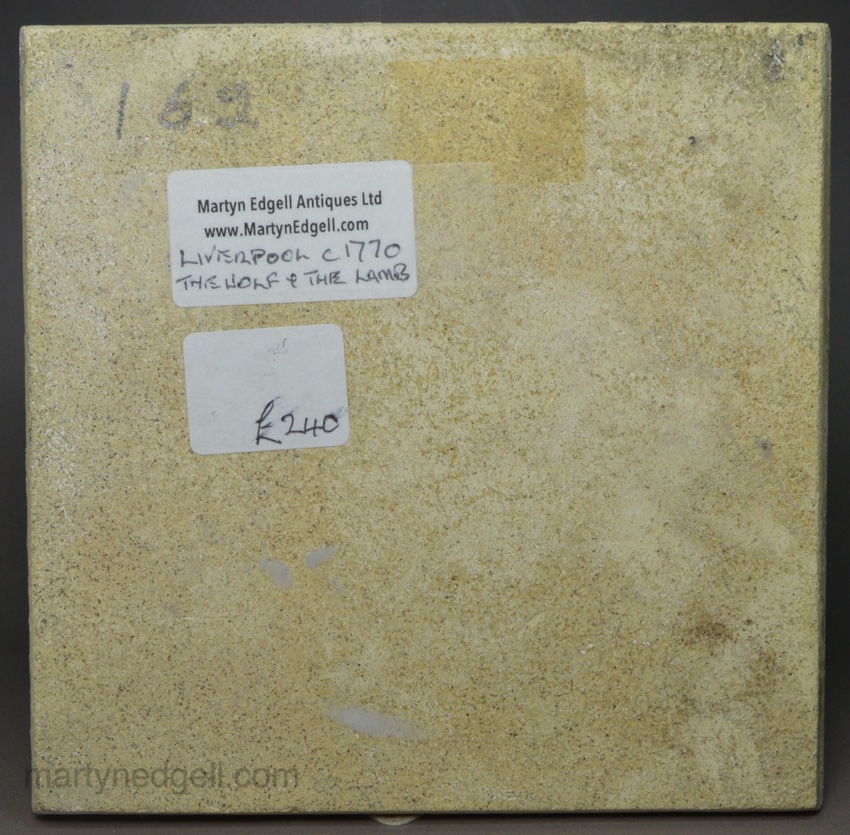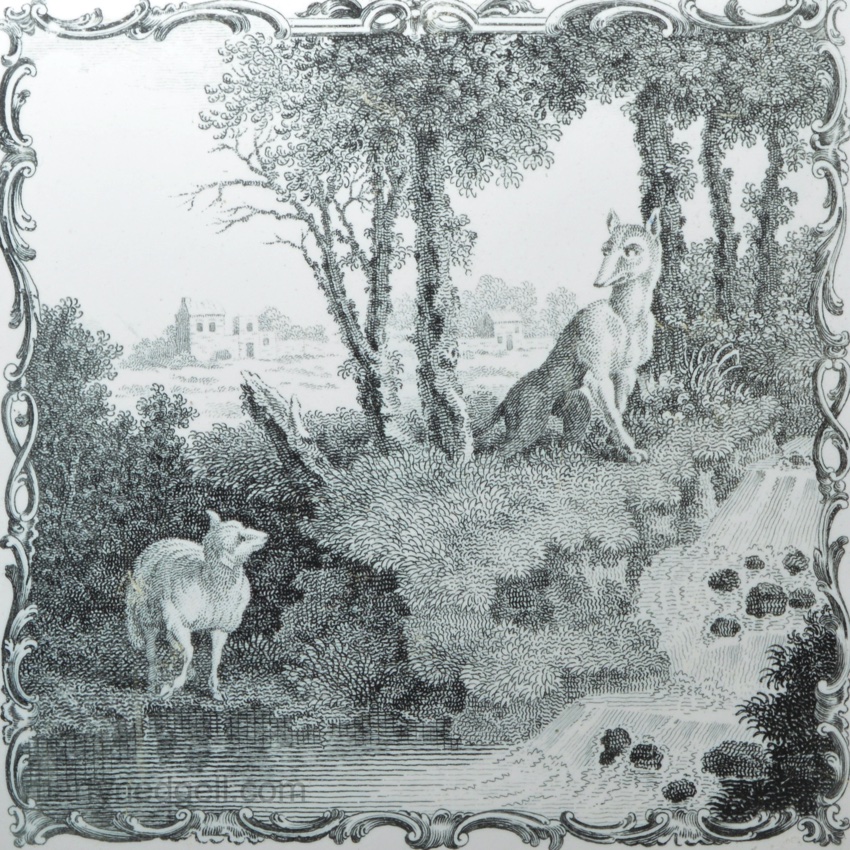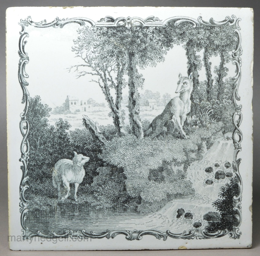 Liverpool delft Aesop’s Fable Sadler printed tile ‘The Wolf and the Lamb’, circa 1770