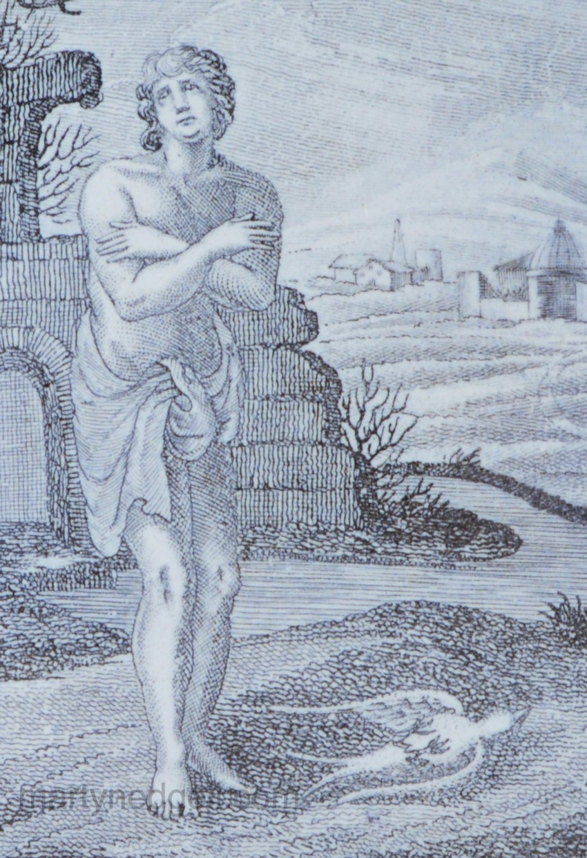 / Liverpool delft Aesop’s Fable Sadler printed tile ‘The Young Man and the Swallow’, circa 1770