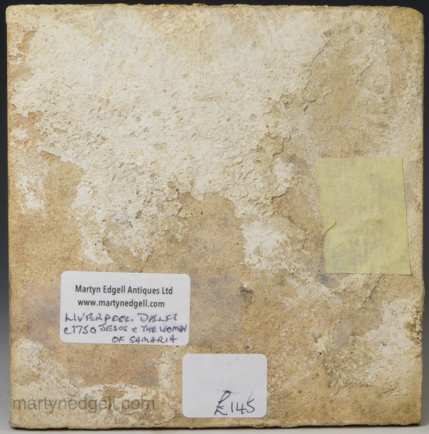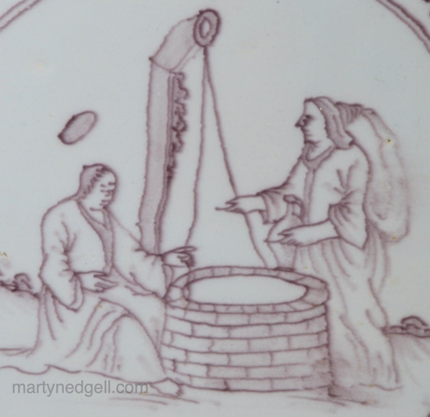 Liverpool delft biblical tile, circa 1750, Jesus and the woman of Samaria