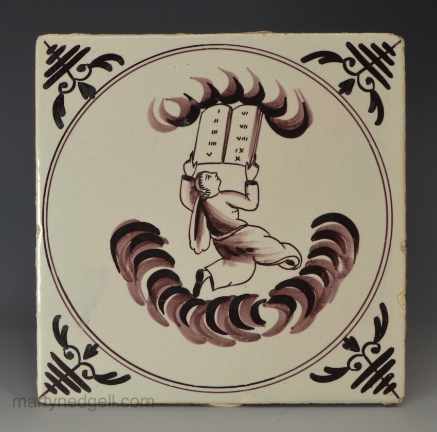 / Liverpool delft biblical tile of ‘ Moses returns with the 10 commandments’, circa 1760