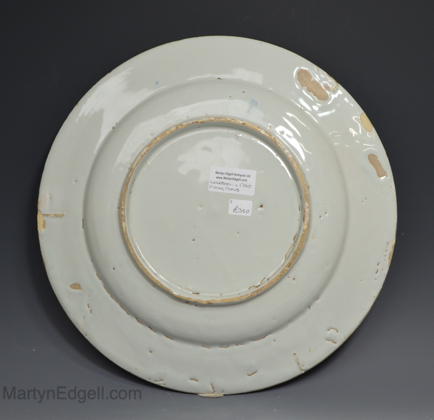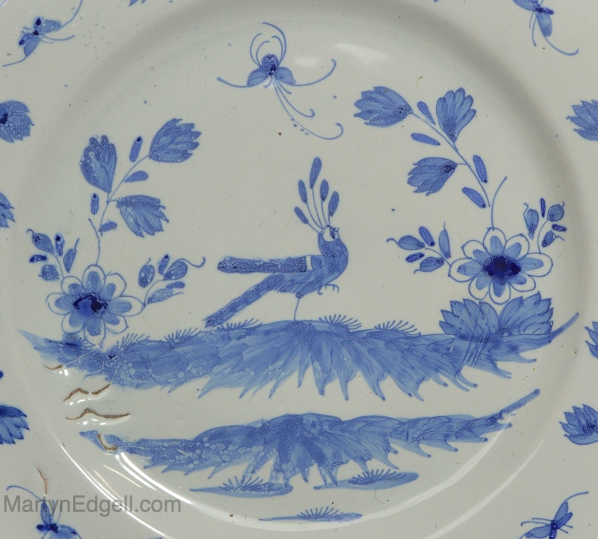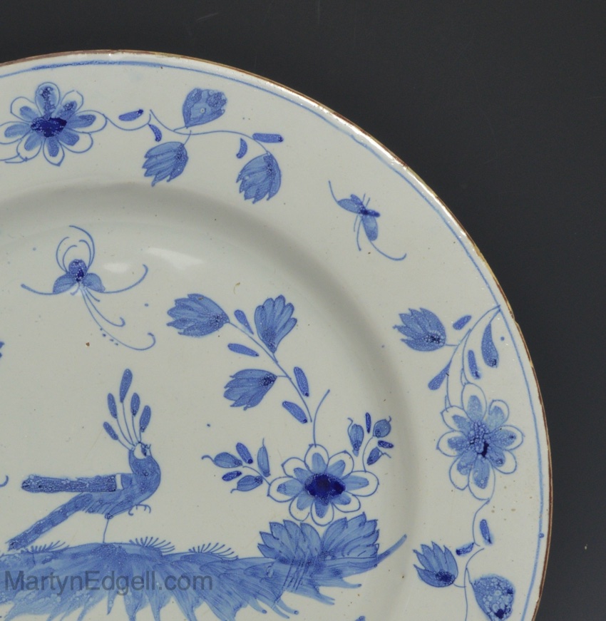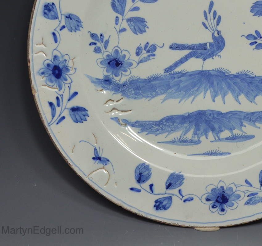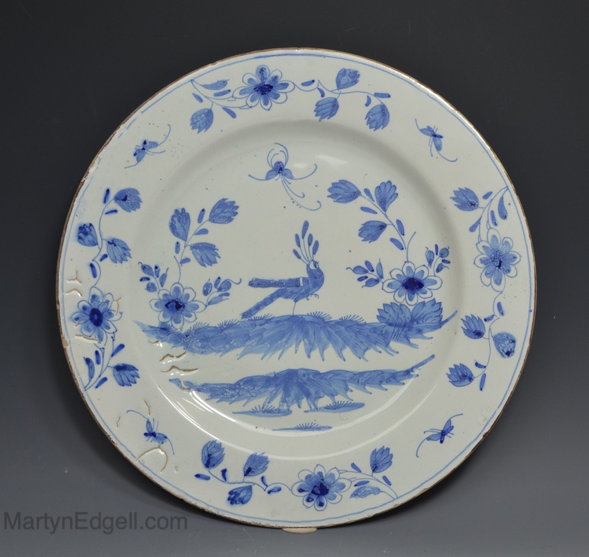 / Liverpool delft charger decorated in blue with a peacock, circa 1760