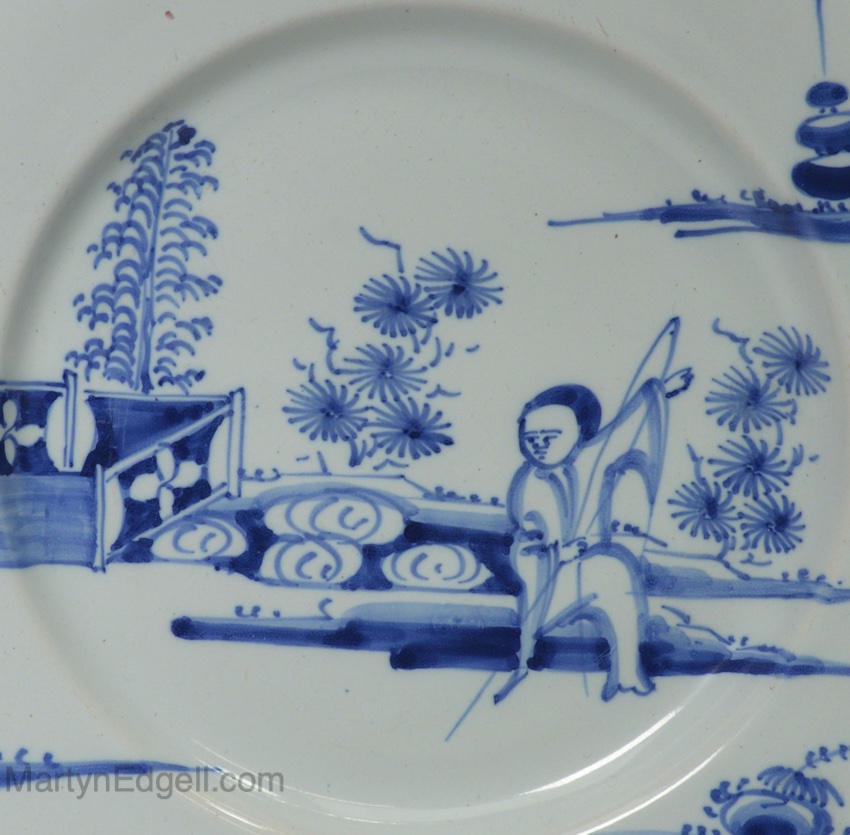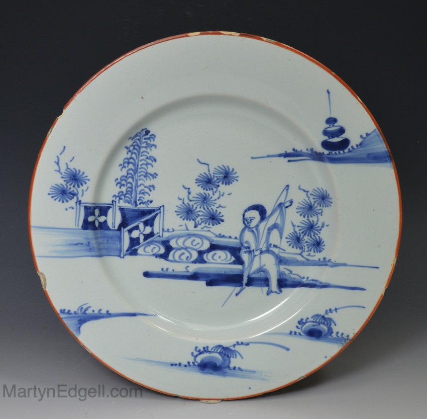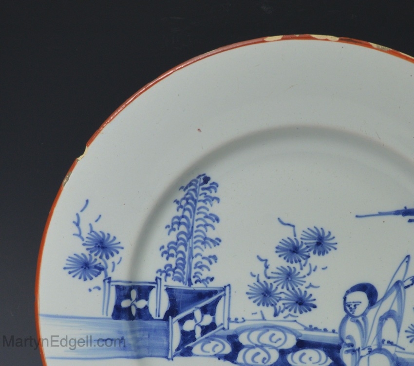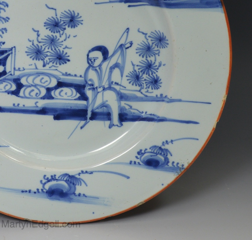 / Liverpool delft plate decorated with a man fishing, circa 1740