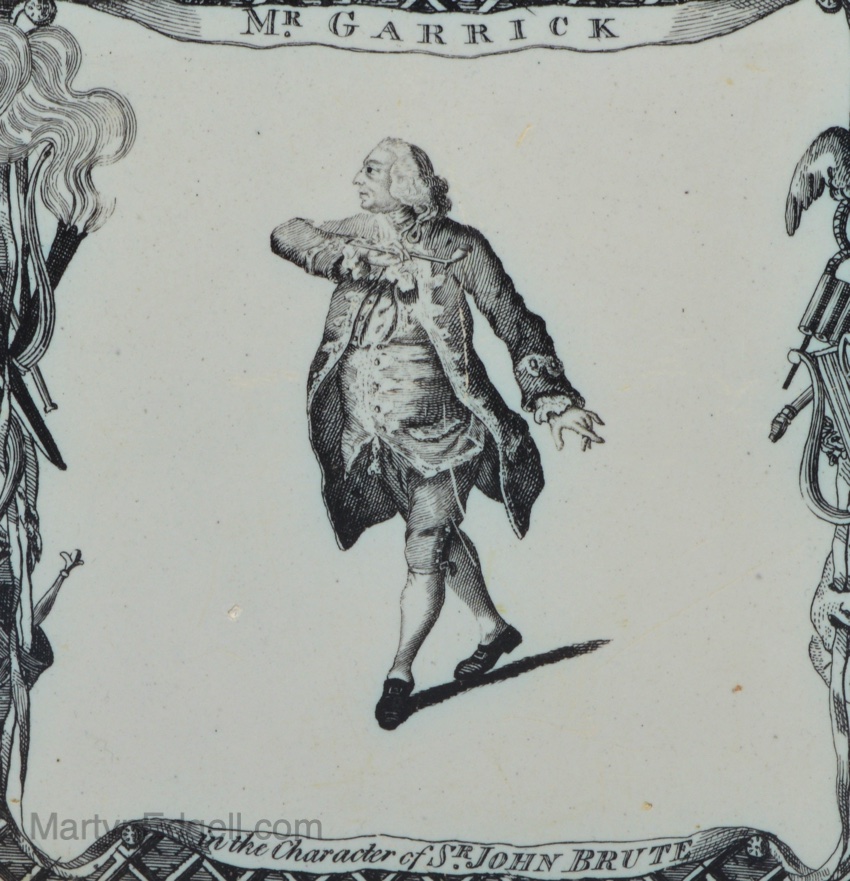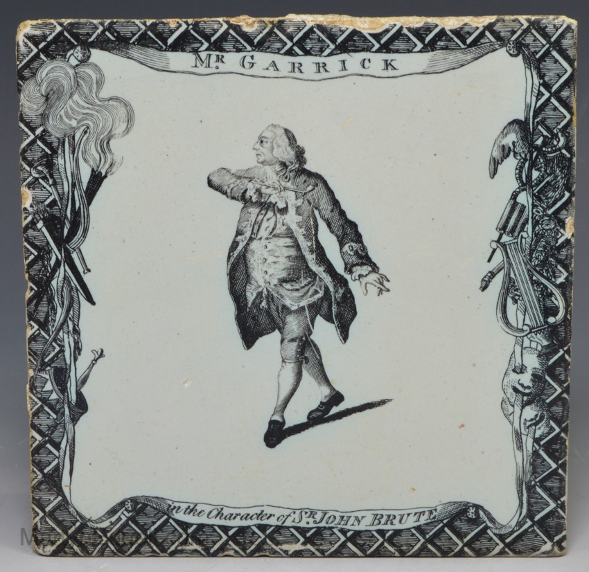 Liverpool delft Sadler printed tile of Mr Garrick in the character of Sir John Brute, circa 1780
