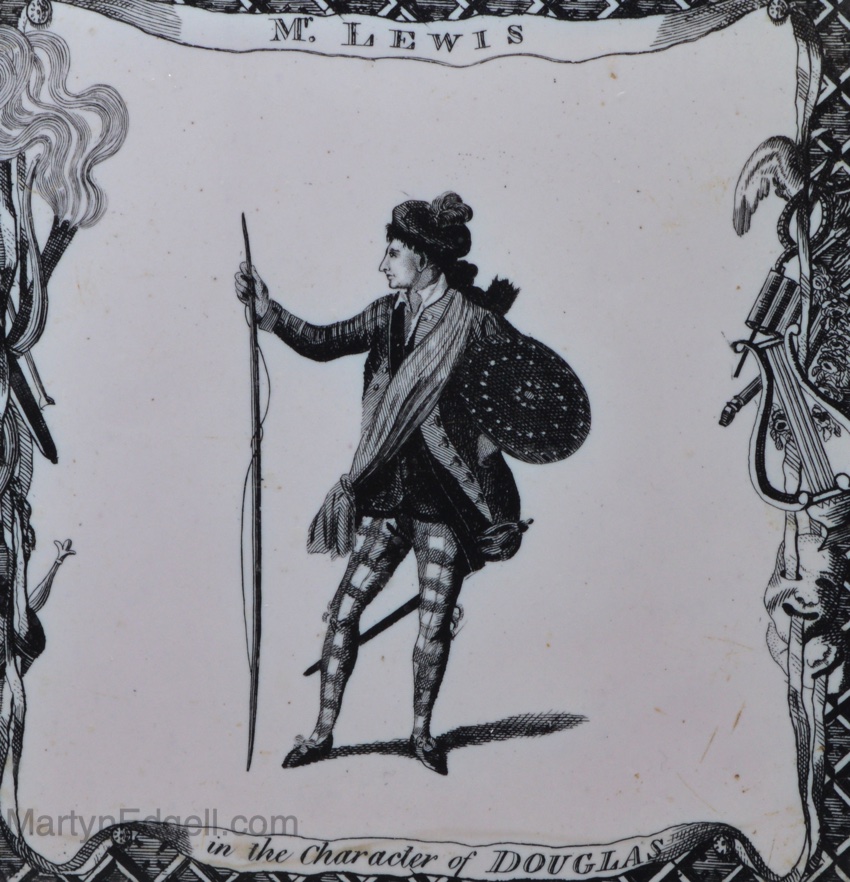 Liverpool delft Sadler tile of Mr Lewis in the Character of Douglas, circa 1775