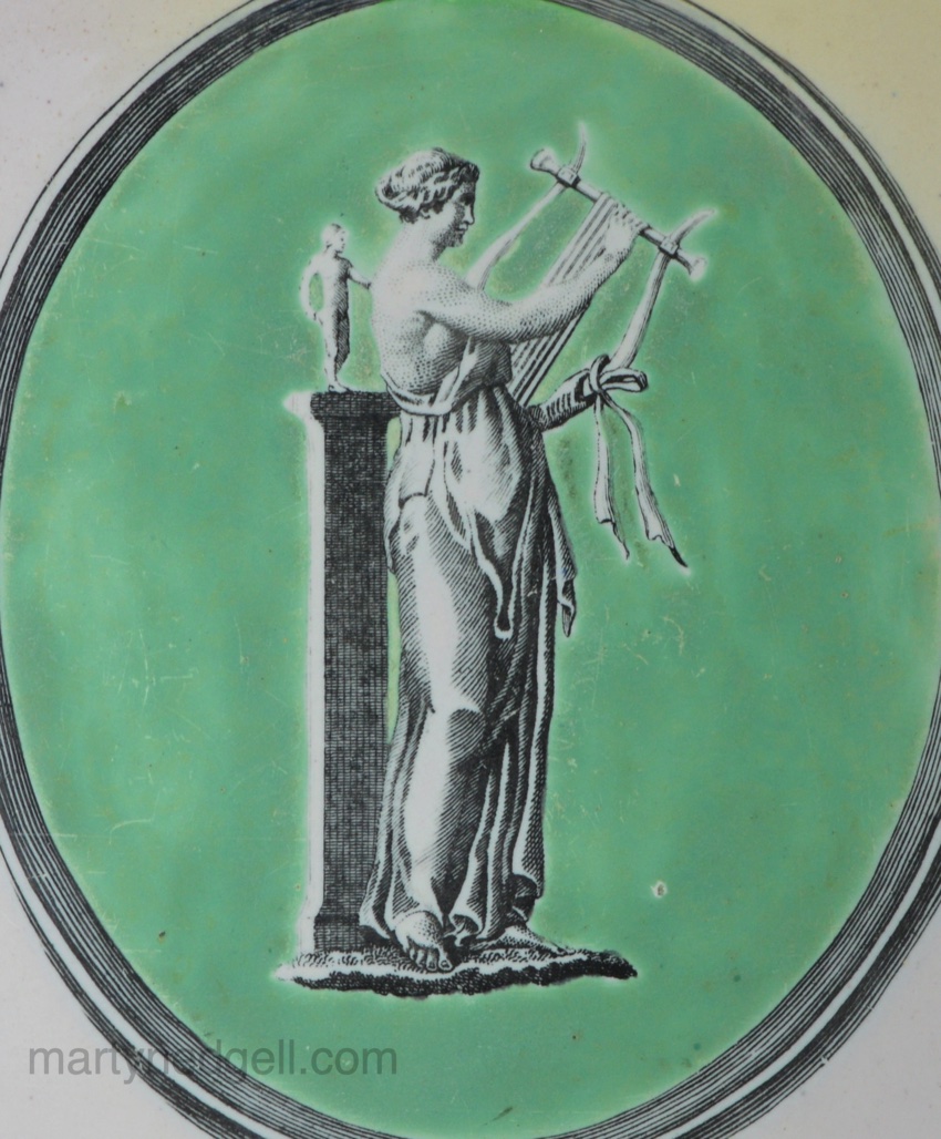 Liverpool delft tile decorated in a Sadler print of a Muse with a lyre, circa 1770