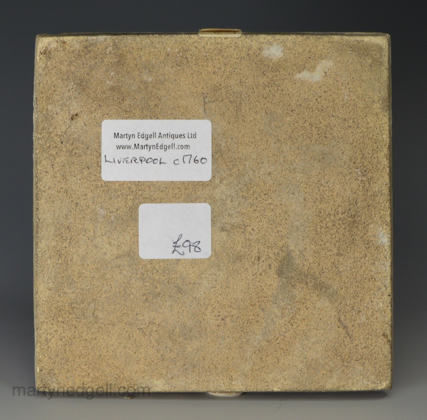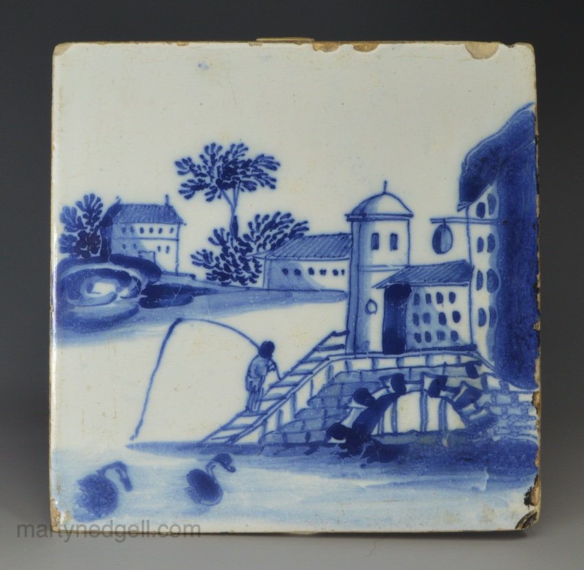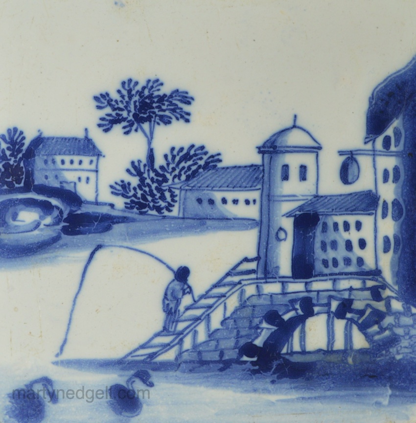 / Liverpool delft tile decorated with a landscape of man fishing, circa 1760