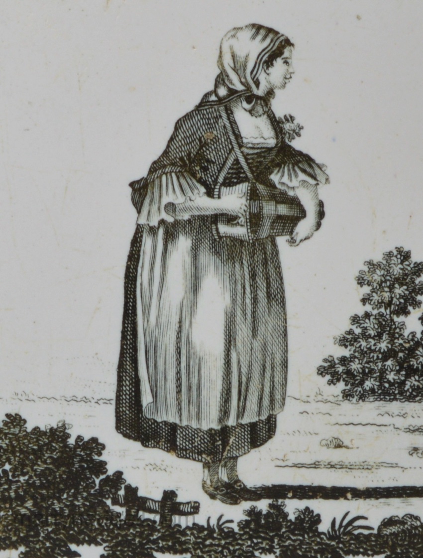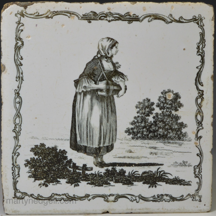 Liverpool delft tile decorated with a Sadler print of a girl playing a hurdy-gurdy, circa 1770