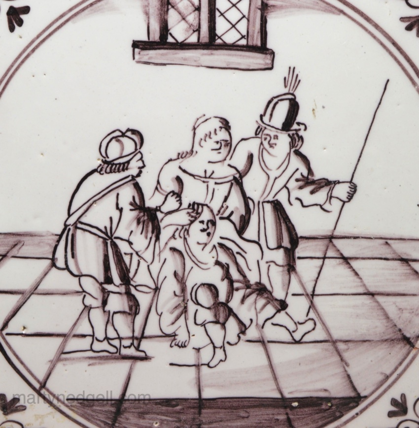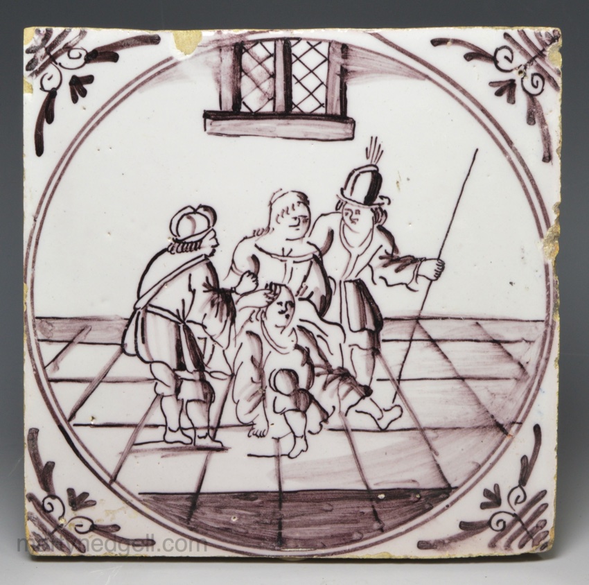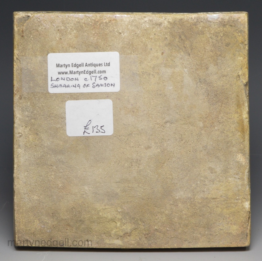 / London delft biblical tile decorated with the shearing of Samson, circa 1750