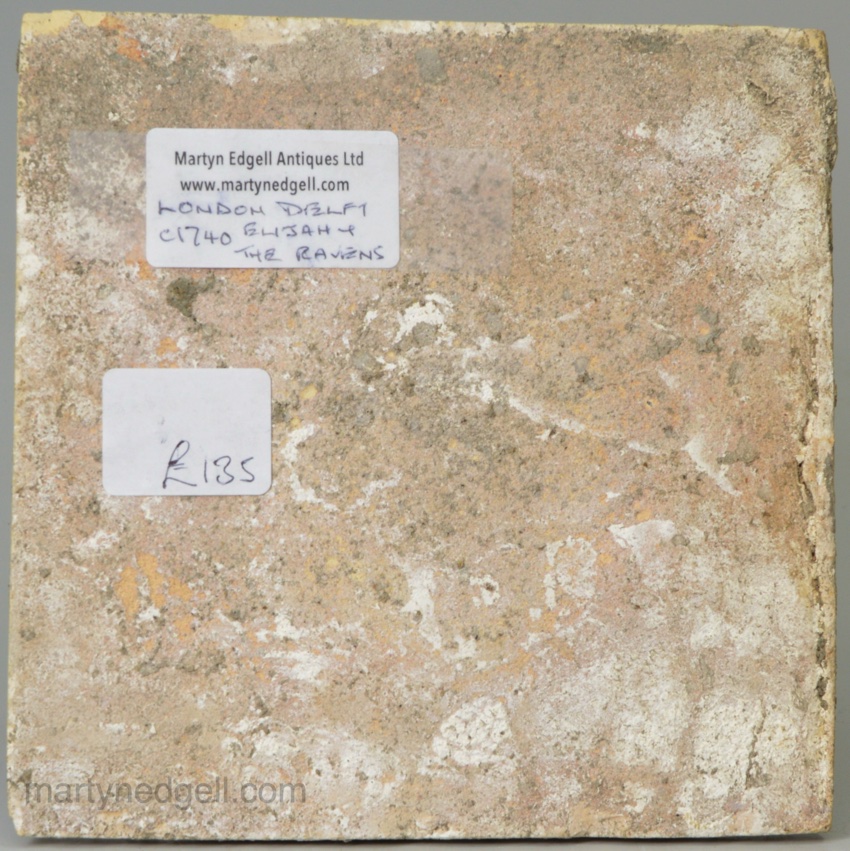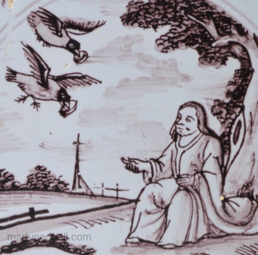 / London delft biblical tile, Elijah and the ravens, circa 1740