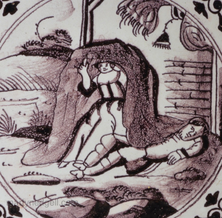 / London delft biblical tile of Ruth and Boaz, circa 1760