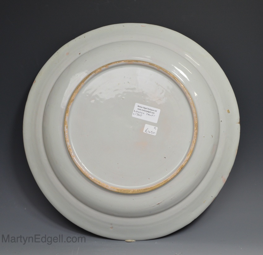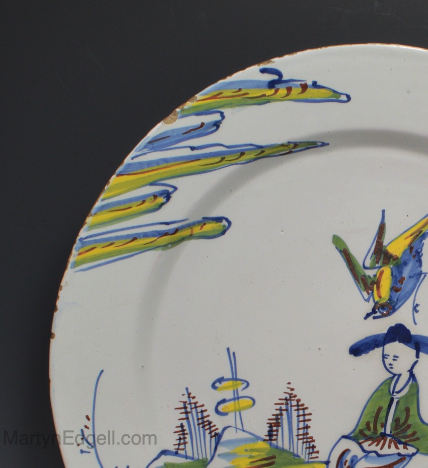 London delft charger painted in polychrome with a Chinese sage in a landscape, circa 1740