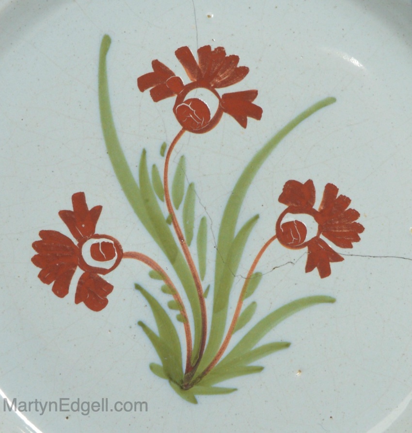 / London delft pancake plate decorated with red, orange and green florals, circa 1740