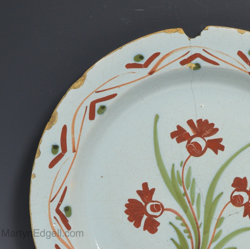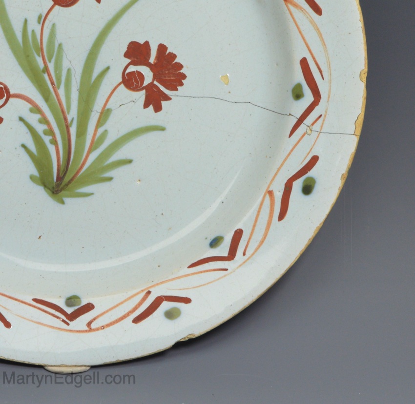 London delft pancake plate decorated with red, orange and green florals, circa 1740