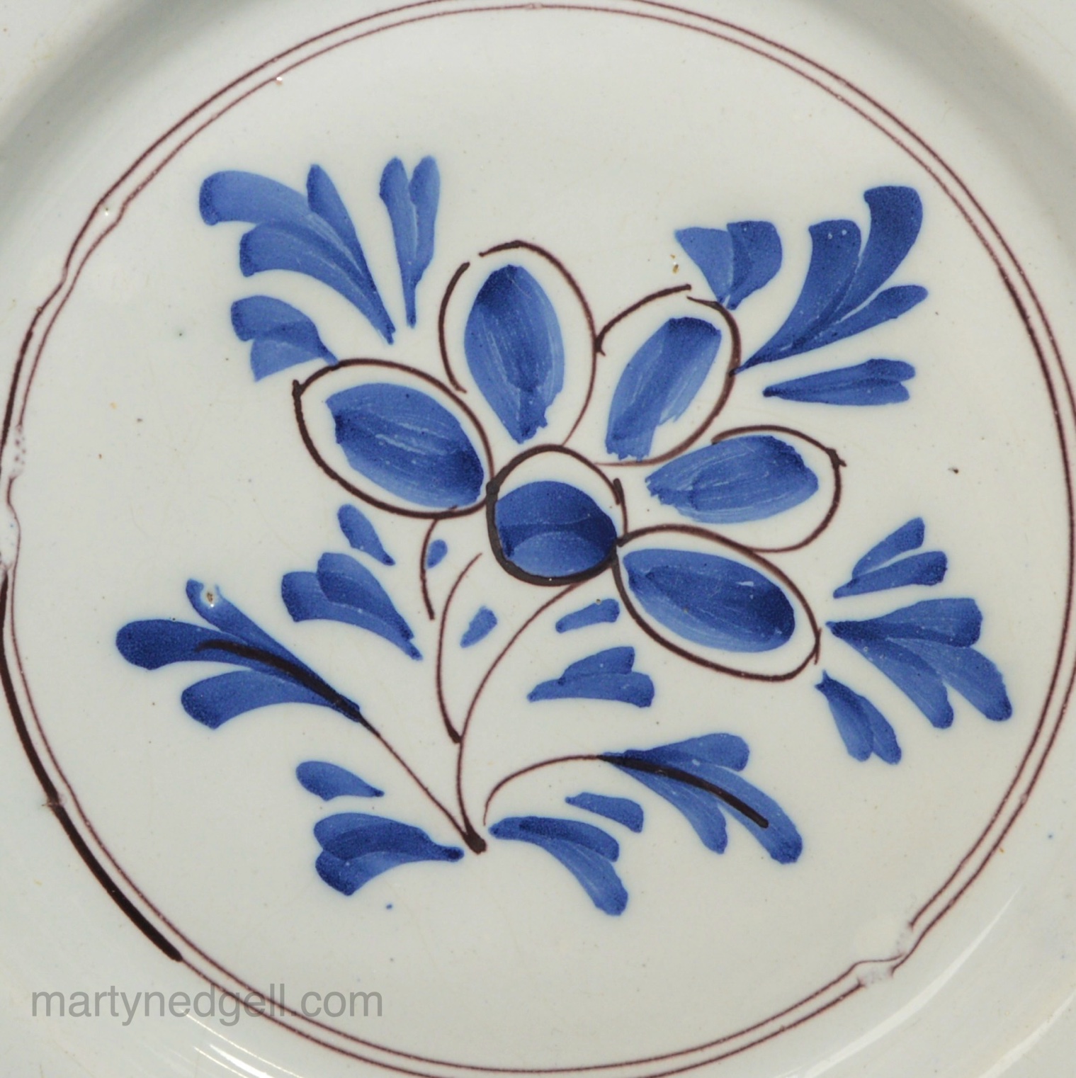 London delft plate pancake decorated in blue and manganese, circa 1740