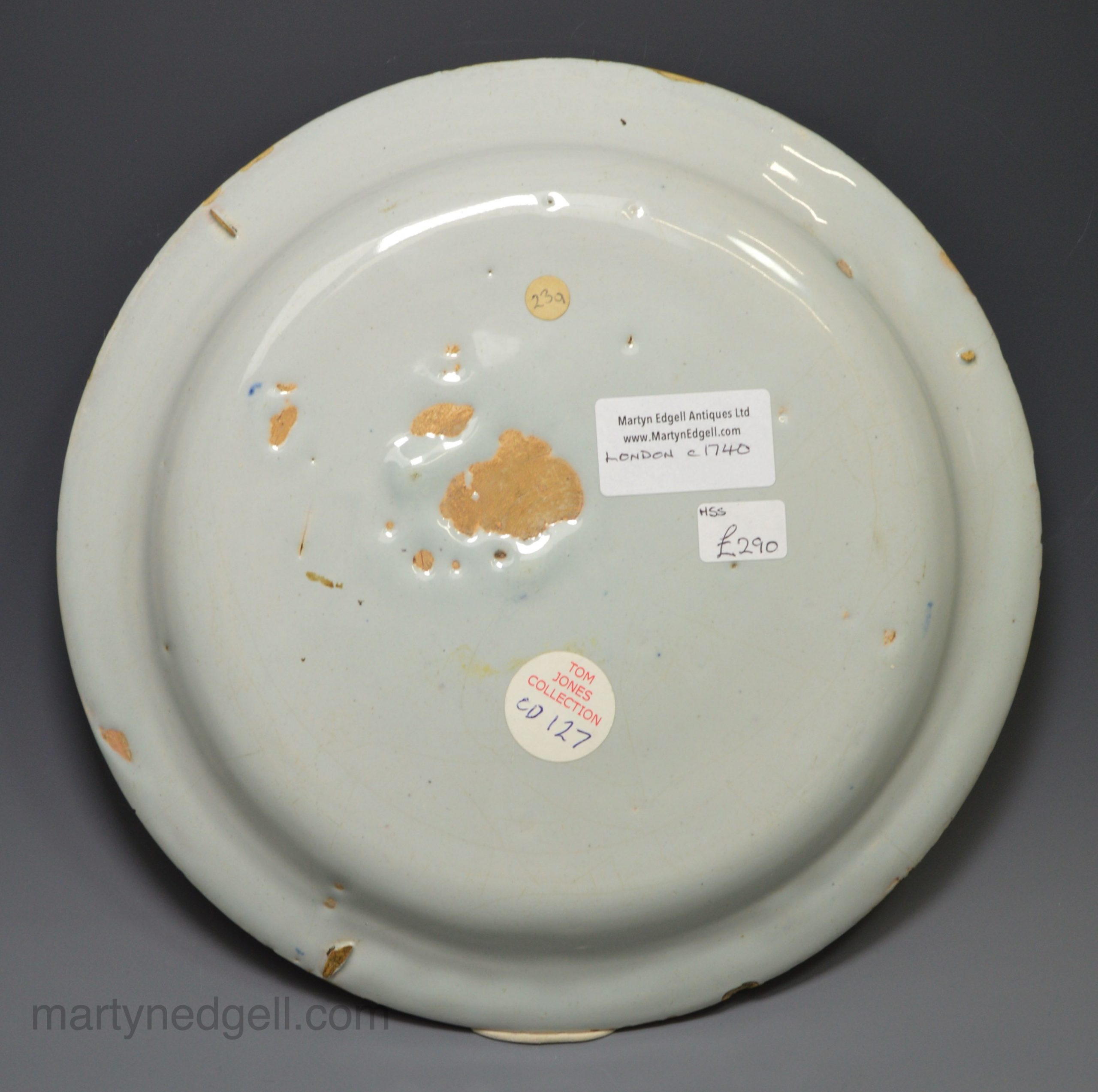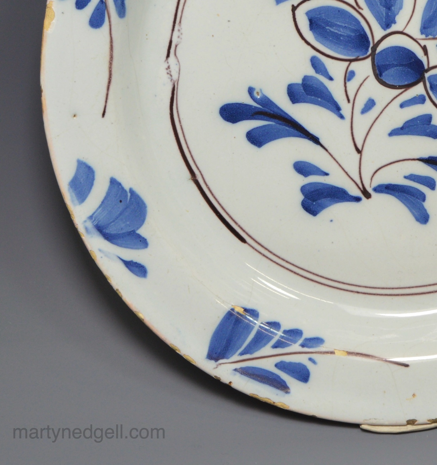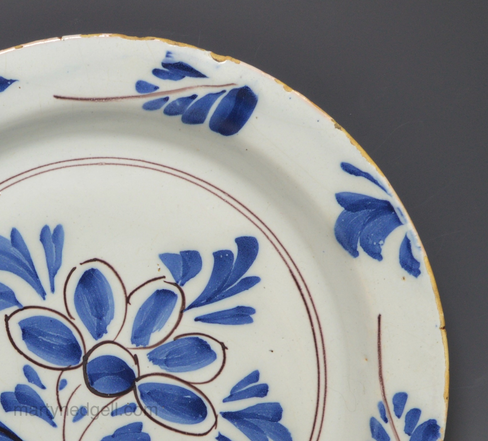 / London delft plate pancake decorated in blue and manganese, circa 1740