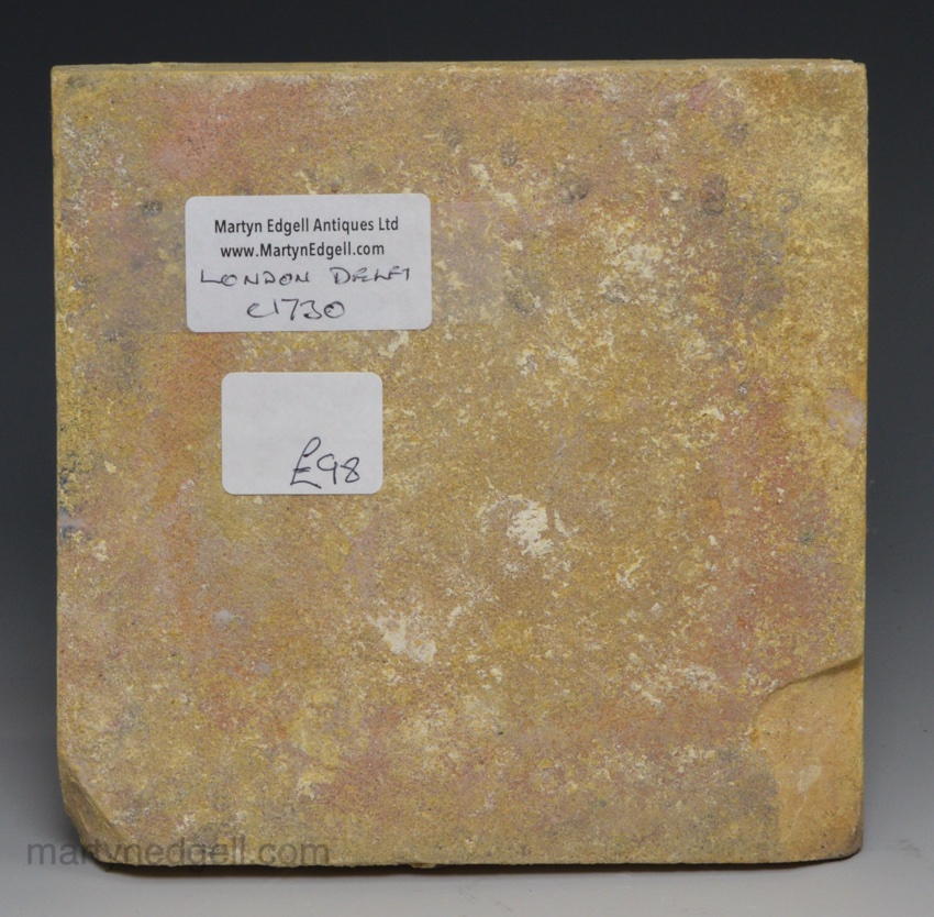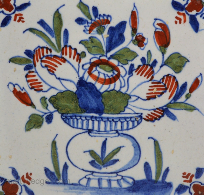 / London delft tile decorated in blue, red and green florals, circa 1730
